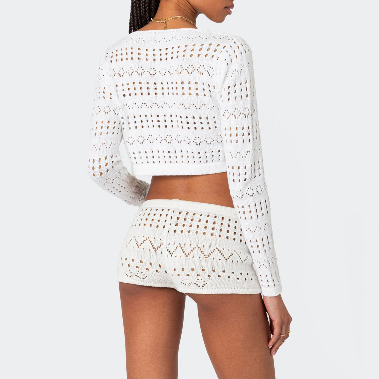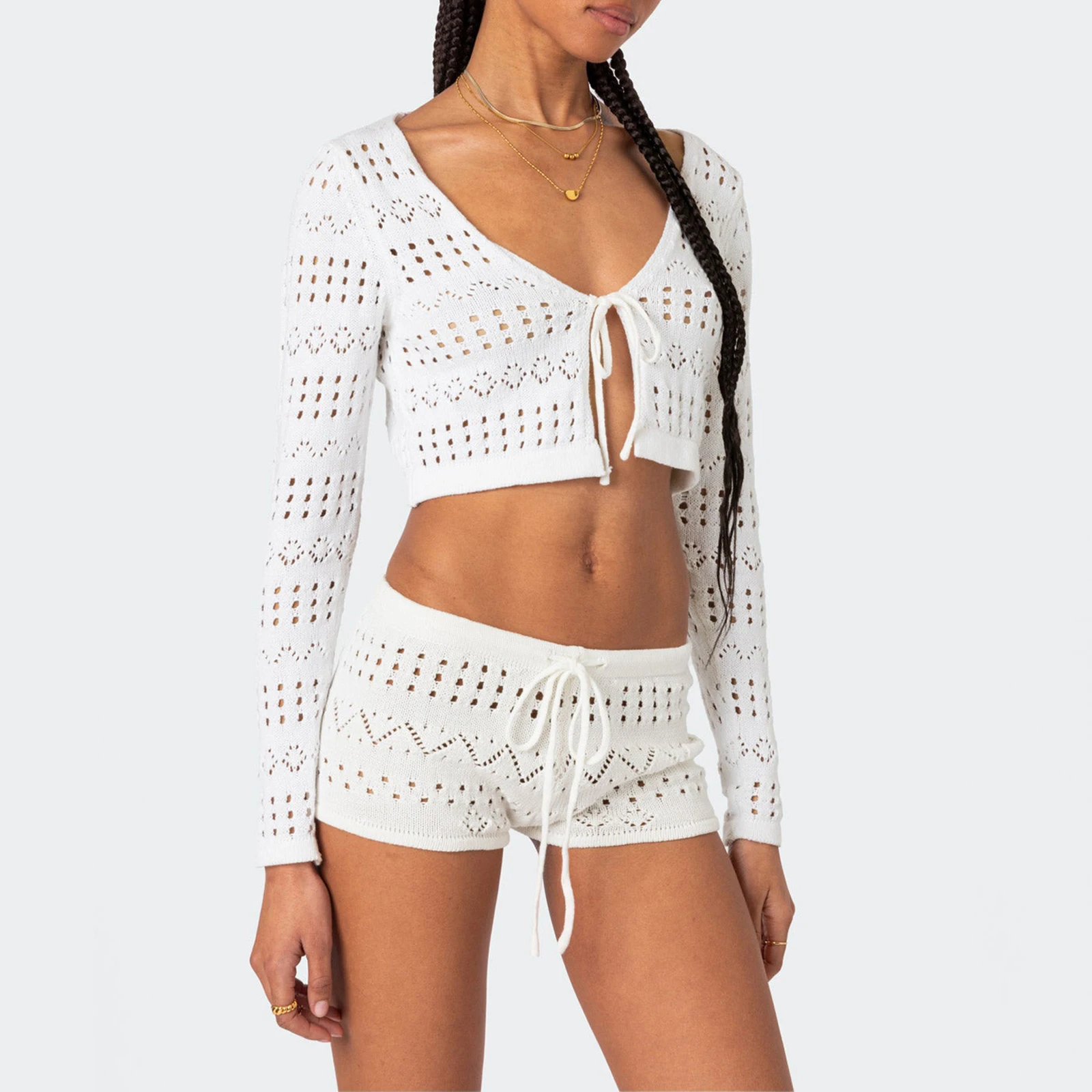 Step onto the sandy shores with confidence and style in our Knitted Swimsuit Beach Cover-Ups. This luxurious crochet shorts set, complete with a long sleeve tie-front cardigan, is designed for the modern woman who appreciates elegance and comfort. Perfect for lounging poolside or enjoying a sunny day at the beach, this outfit embodies effortless chic, making it a must-have addition to your resort wear collection.