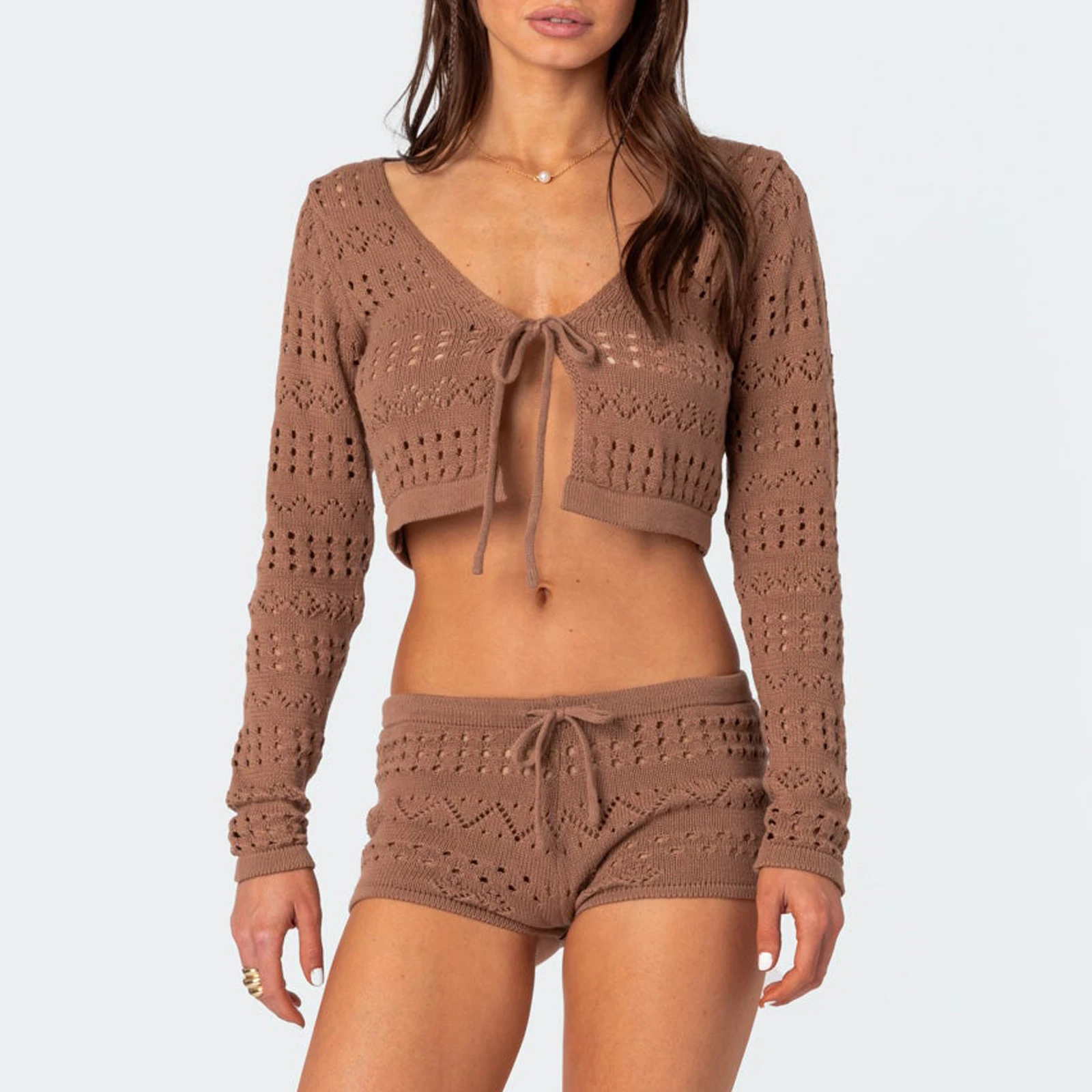 Step into style with this luxurious knitted swimsuit cover-up set. Crafted from soft polyester, the long sleeve tie-front cardigan pairs beautifully with chic crochet shorts, making it perfect for beach outings. Available in elegant brown and white, this true-to-size set combines comfort and sophistication, ensuring you look effortlessly fabulous.