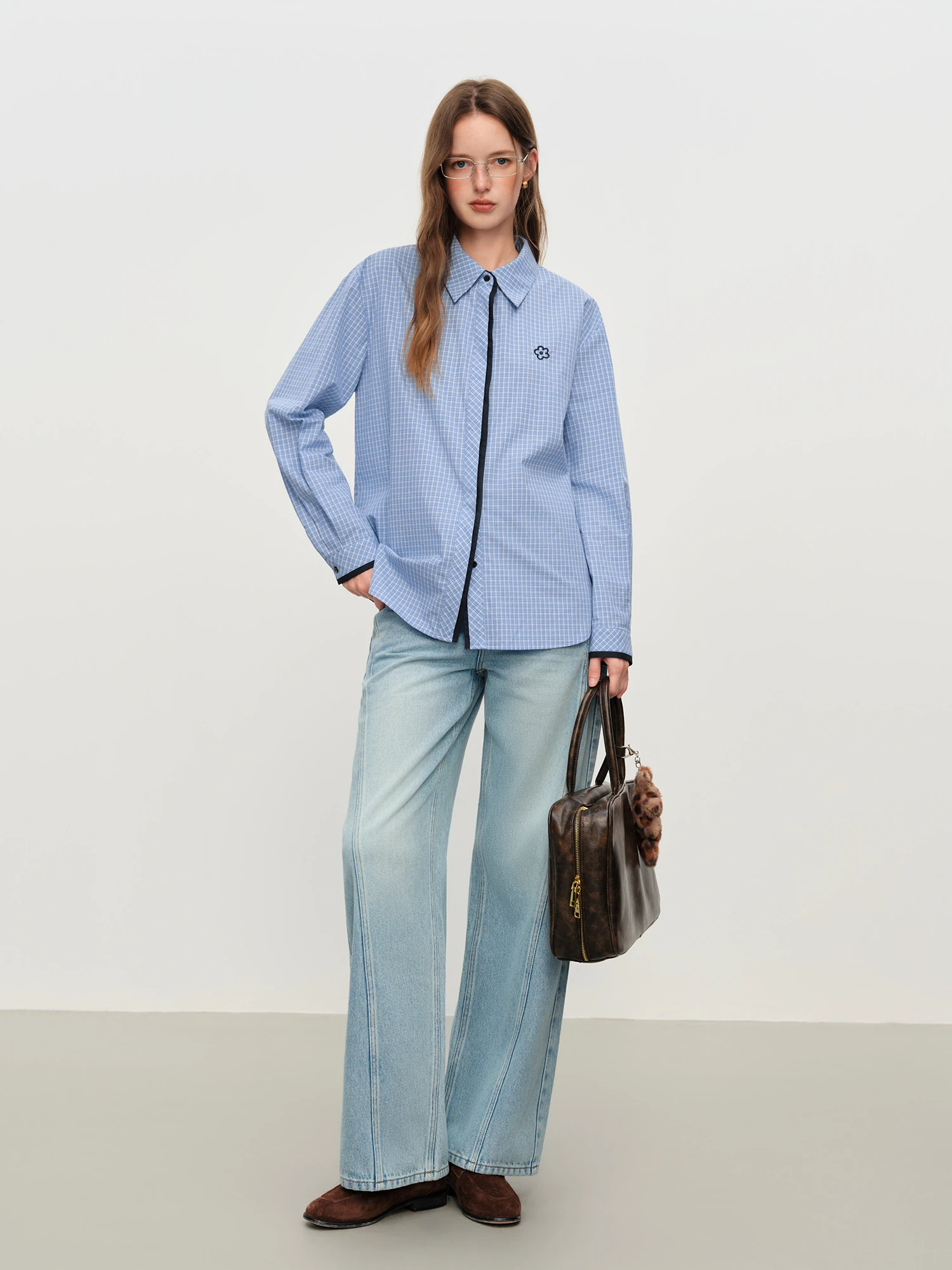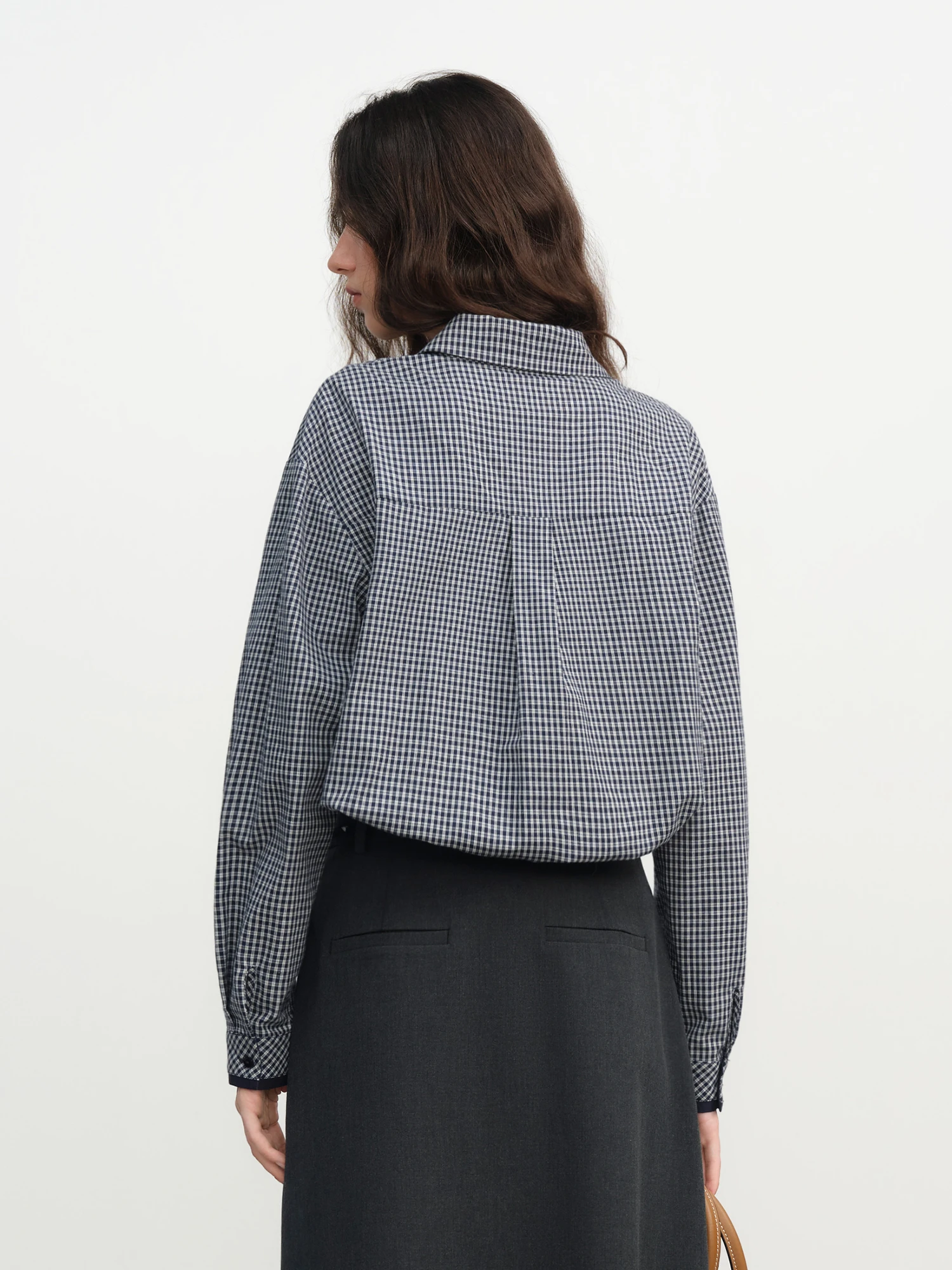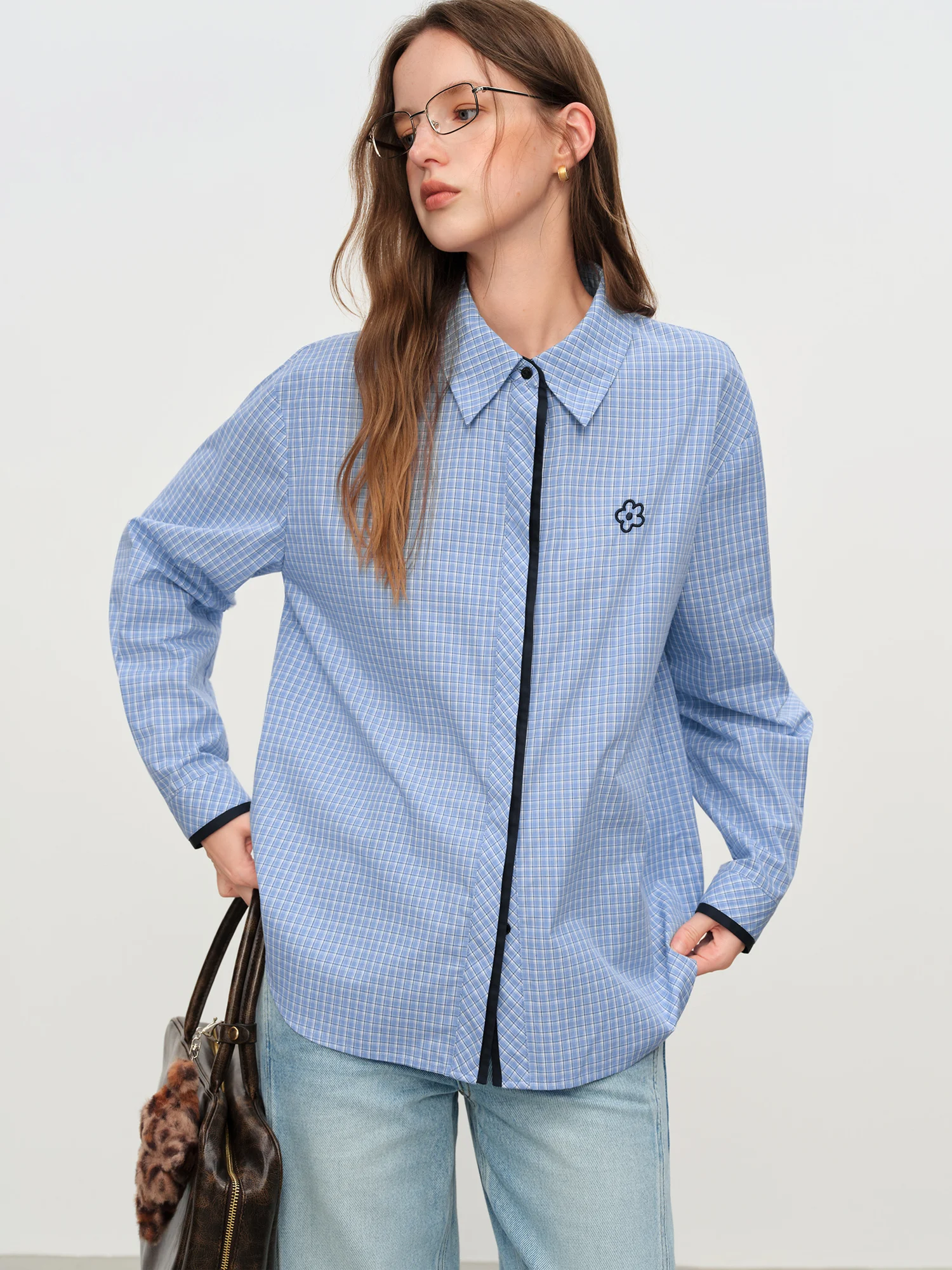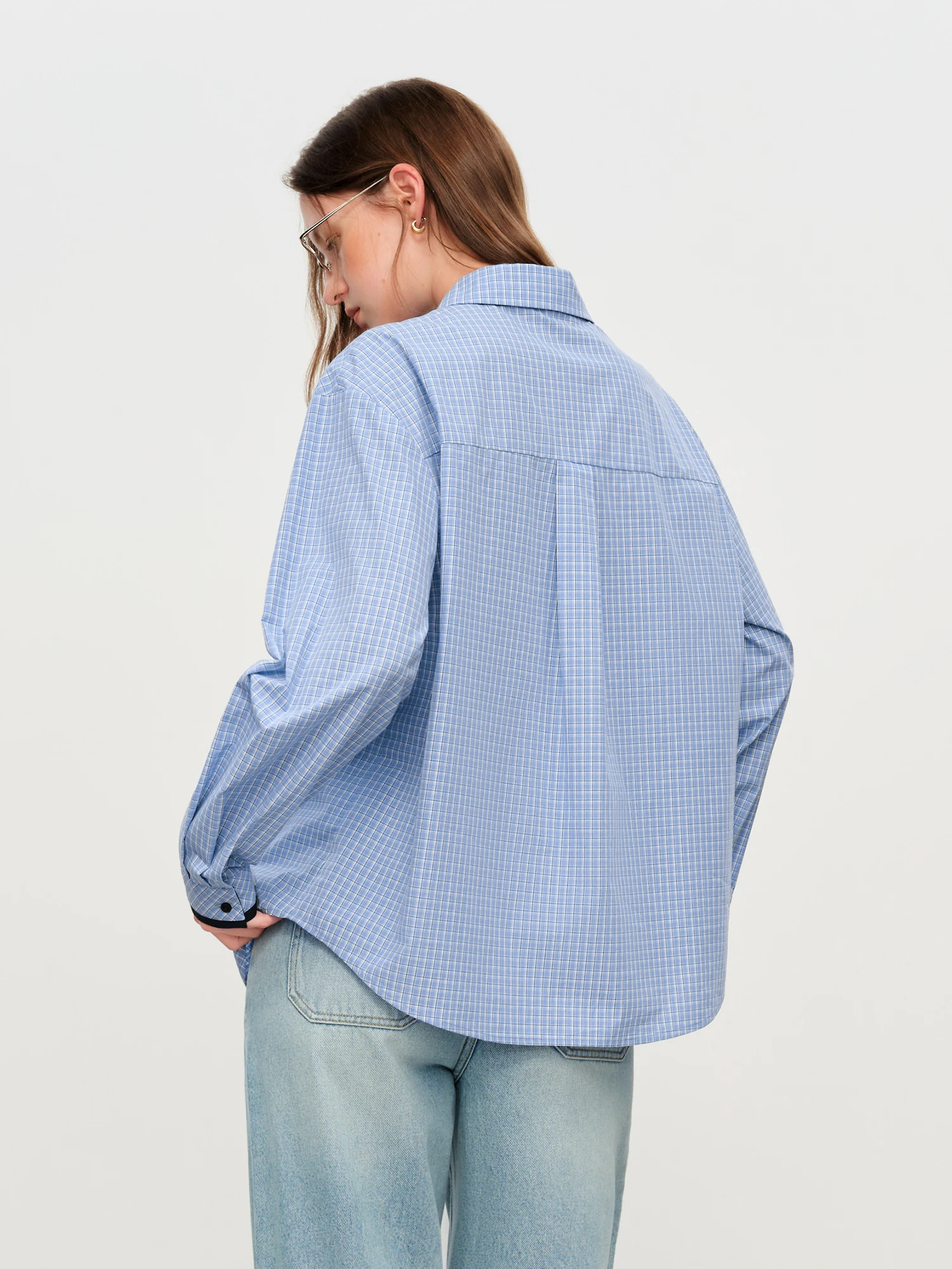 Designed for the discerning woman seeking a refined casual shirt, this Korean Plaid Shirt in Royal and Sky Blue offers a loose, comfortable fit crafted from a blend of cotton, regenerated cellulose, and polyester. Its broadcloth fabric provides a smooth texture suitable for autumn and winter wear.