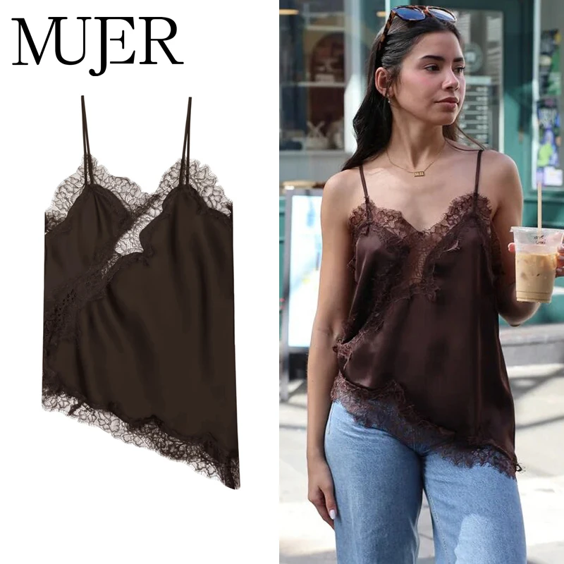 This Lace Backless Camisole with Asymmetric Sleeveless Design is crafted from 100% polyester with delicate lace detailing, offering a lightweight and breathable option for summer evenings or night outs. Designed for women seeking a modern, sleek silhouette, it fits true to size with a non-stretch fabric that maintains its shape.