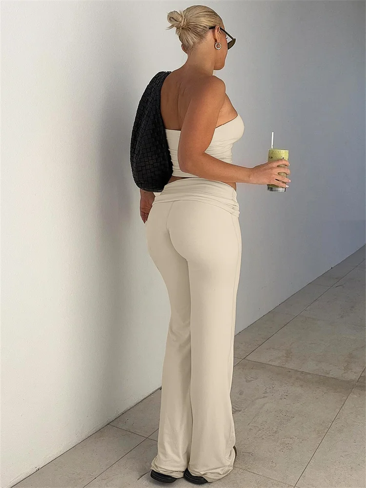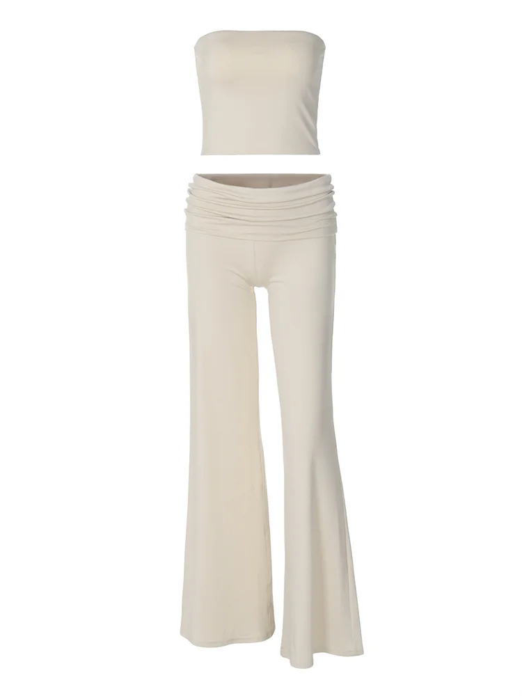 Experience refined modernity with the Lana Tube Top and Fold Over Flared Pants Set, a thoughtfully designed ensemble that balances sleek elegance with comfort. This two-piece set features a slim-fitting, strapless tube top paired with ankle-length flared pants, both crafted from a slightly stretchy polyester blend that allows ease of movement throughout your day. Available in sophisticated black, apricot, and gray, this set is tailored to suit the warmer spring and summer seasons.