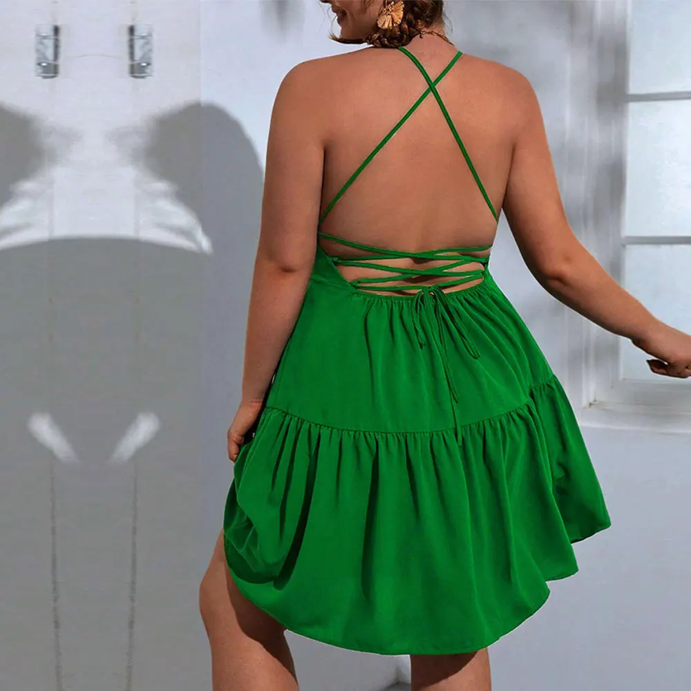 Unveil your inner elegance with this chic backless camisole, perfect for stylish vacations. Crafted from soft polyester with a flattering A-line silhouette, it features a V-neck and playful ruffles. Available in a vibrant green, this knee-length piece offers a relaxed fit and slight stretch for comfort. Embrace effortless sophistication this summer.