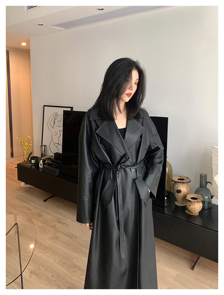 Step into sophistication with this long black leather trench coat. Crafted from luxurious faux leather, it features oversized sashes and a single button closure, perfect for a chic, loose fit. With functional pockets and an adjustable waist, this versatile piece is ideal for any season, making it a staple for the modern woman.