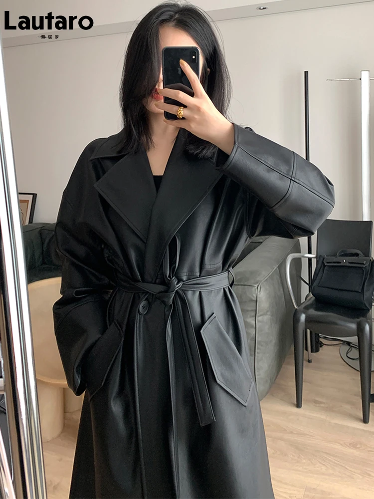 Chic Lautaro Long Black Faux Leather Trench Coat for Women