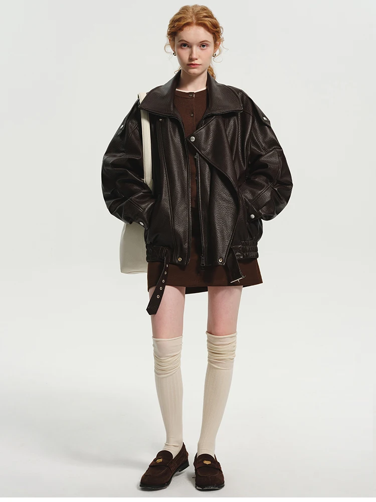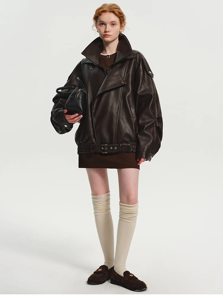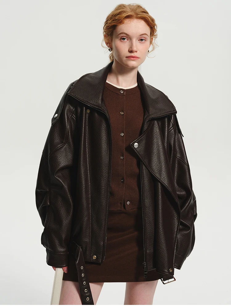 Chic Brown Oversized PU Leather Jacket for Bold Women