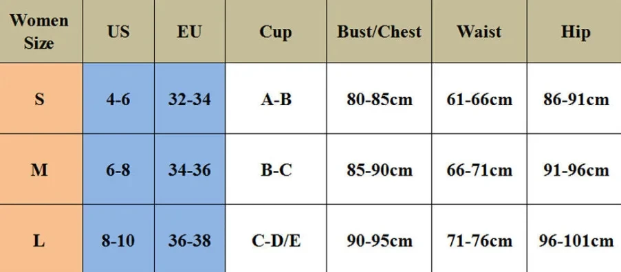 | Size | US | UK | AU/NZ | EU | Bust (cm) | Waist (cm) | Hips (cm) |