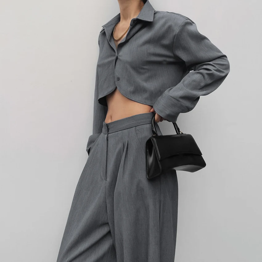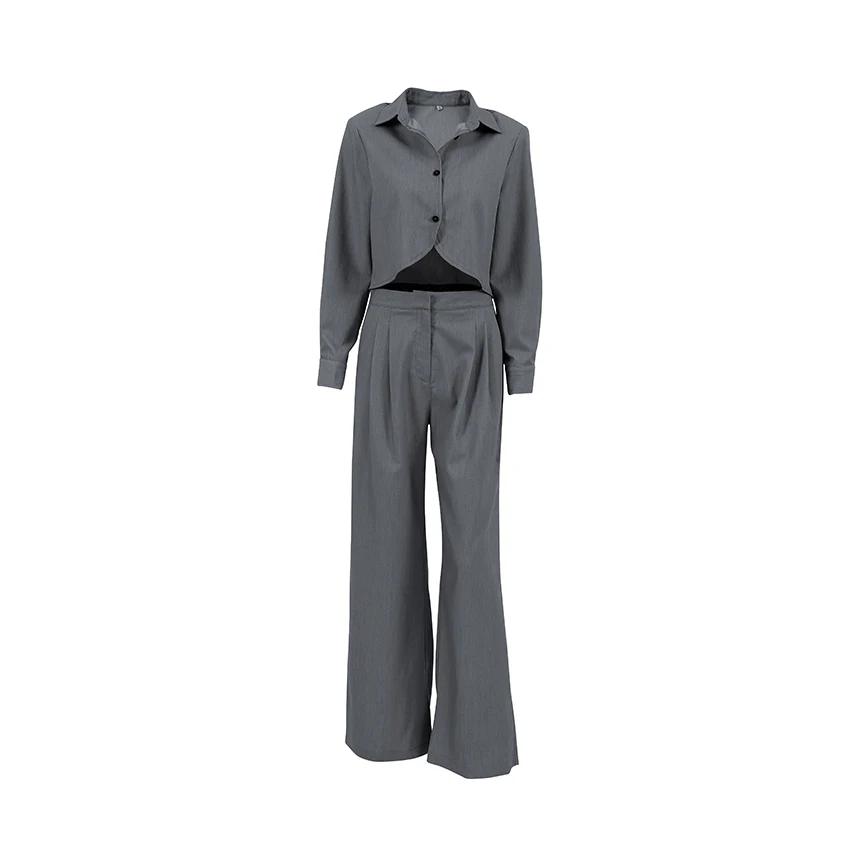 Step into sophistication with these elegant gray high-waist pants, perfectly paired with a chic lapel shirt. Crafted from premium synthetic fibers, this luxurious two-piece set features a flattering silhouette with wide-leg trousers and a cropped top, ideal for any office setting. Embrace effortless style this summer while enjoying a confident fit and timeless appeal.
