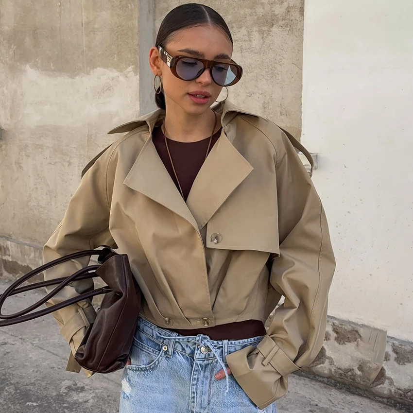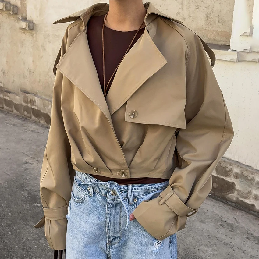 Step into sophistication with this khaki double-breasted jacket, designed for the modern office lady. Crafted from luxurious polyester, it features a timeless notched collar and elegant button detailing. The relaxed fit and pleated design ensure comfort without compromising style. Perfect for all seasons, this chic outerwear is your go-to for effortless elegance.