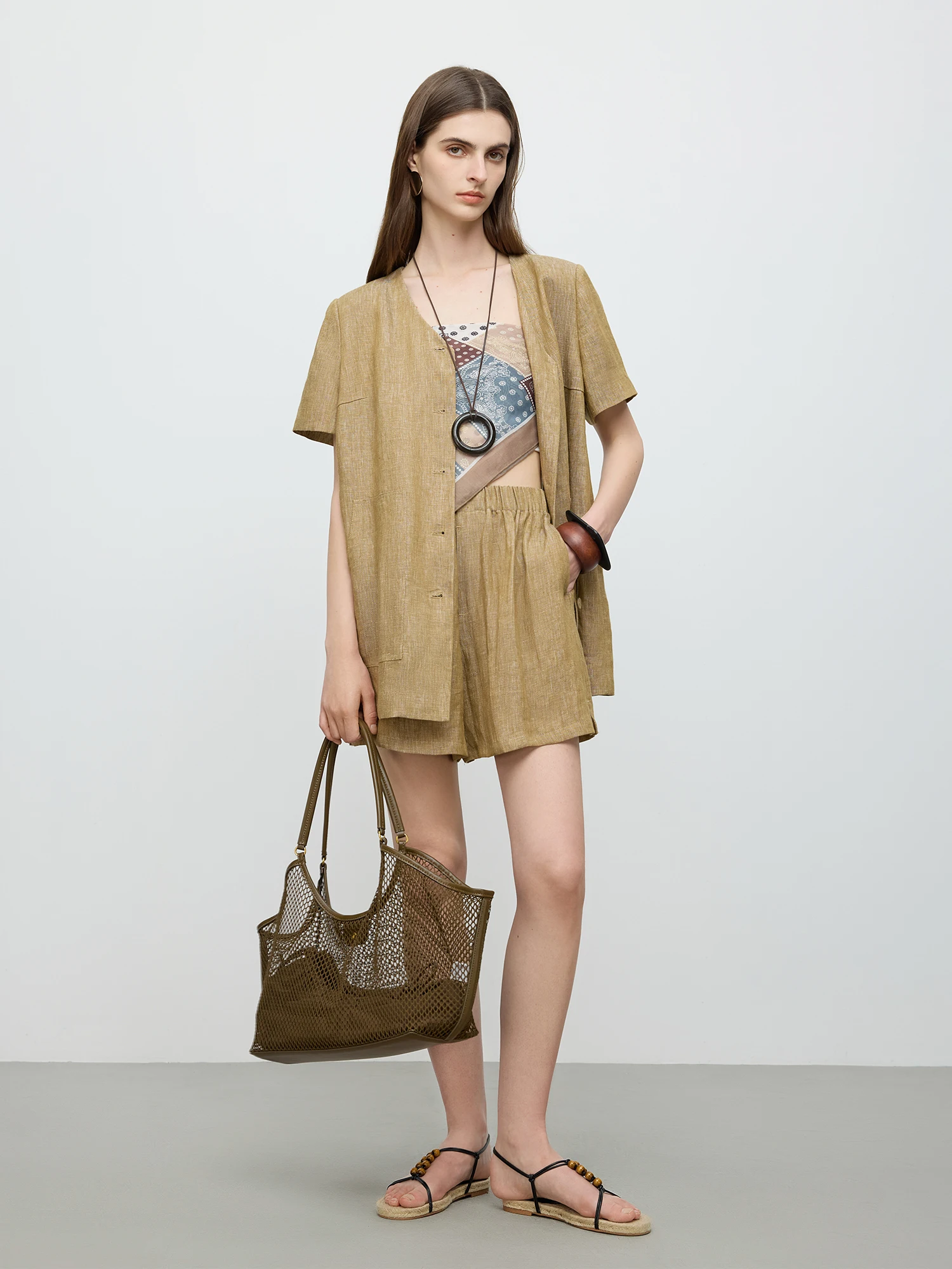 - Design Details: V-neck collar, single-breasted front, and practical pockets on the elastic waist shorts.
