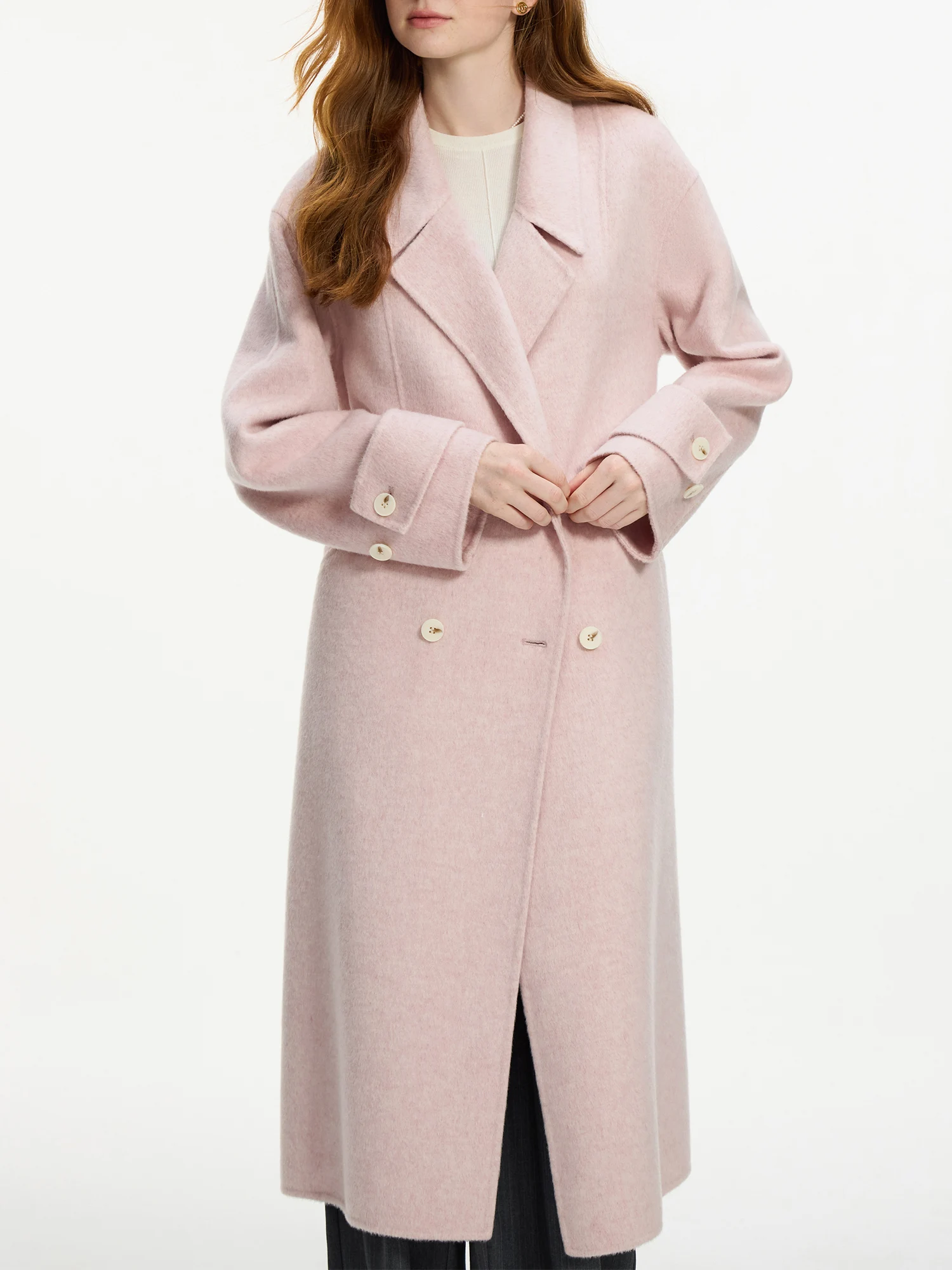 Q: What is the fabric composition and how does it feel?A: Made from a knit blend of wool and alpaca, this coat offers a soft texture with warmth suitable for cooler autumn and winter days. The fabric has a gentle structure and natural insulation.