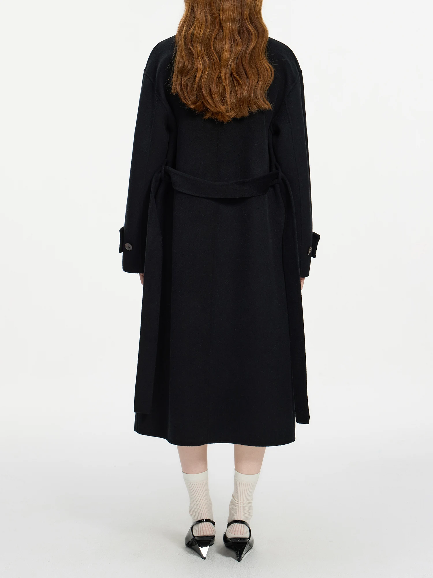 This long coat, crafted from a blend of wool and alpaca, offers a refined yet approachable outerwear option for cooler seasons. Designed with a wide waist and sash detail, it creates a flattering silhouette that balances structure with softness. The single-breasted closure and V-neck collar lend subtle sophistication, making it suitable for both casual and more polished ensembles.