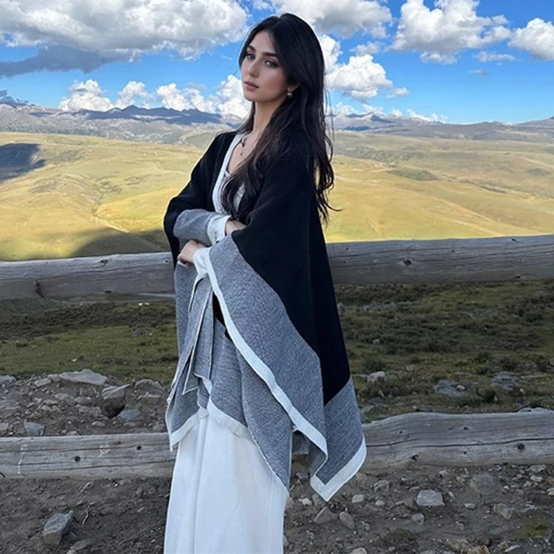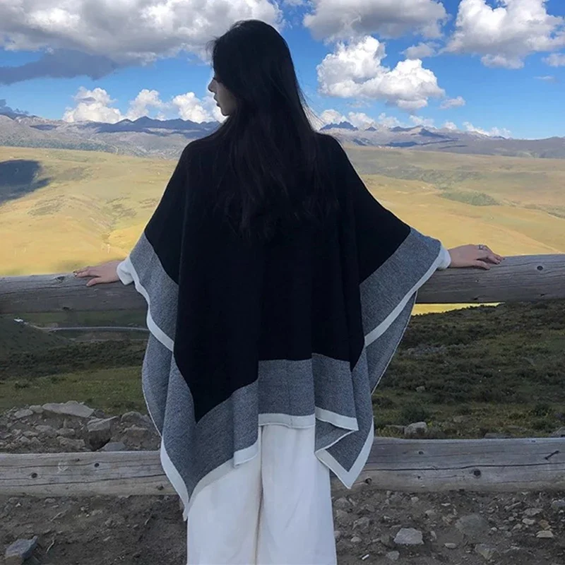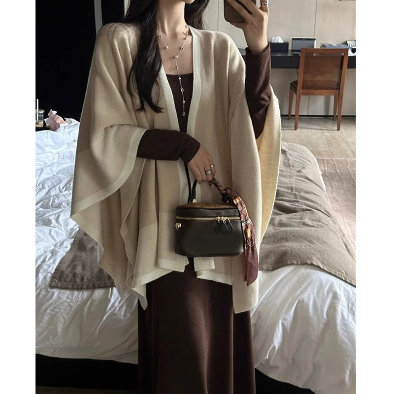 This loose knit women’s cape shawl is designed for comfort and ease during the autumn and winter months. Featuring a long fit with a V neck and three-quarter sleeves, it offers a relaxed silhouette suited to casual wear. The patchwork pattern and spliced decoration add subtle visual interest without overwhelming the minimalist aesthetic.