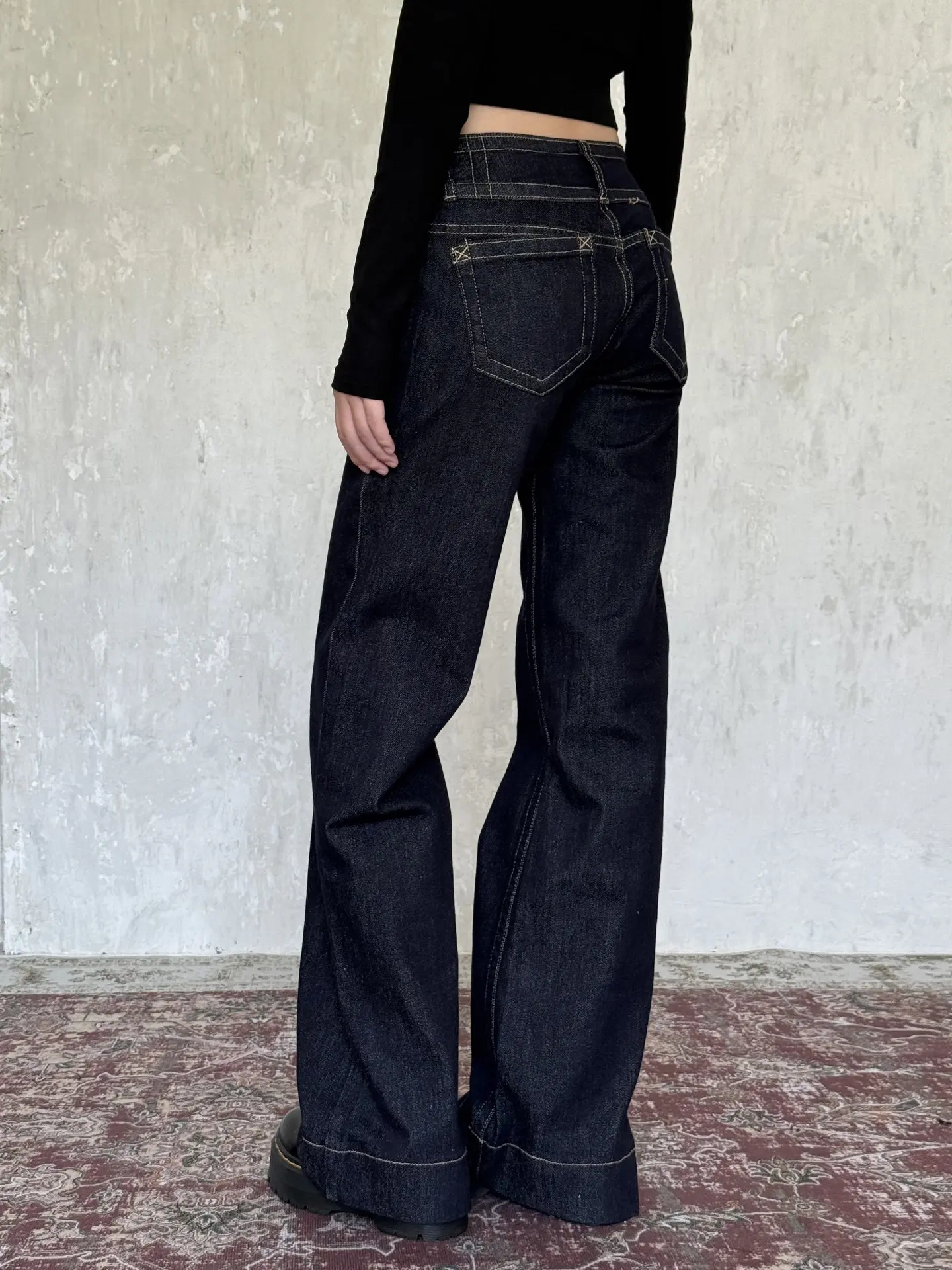 A full-length wide-leg jean in washed blue denim, shaped with a high waist and a generous flare from hip to hem. The loose silhouette gives this pair a relaxed, unhurried proportion — roomy through the thigh and falling straight to the floor with a clean, wide opening. It’s a shape that reads equally well dressed up or down, and one that works across seasons with the right layering.