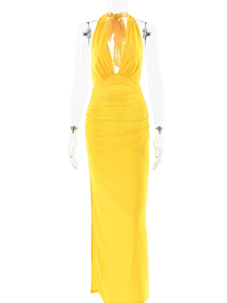 Elevate your evening wardrobe with the Luxe Satin Split Maxi Gown, designed for women who appreciate refined elegance. Crafted from smooth polyester with a slight stretch, this slim-fit gown offers both comfort and a flattering silhouette. The V-neckline and backless detail add a tasteful allure, perfect for formal occasions or summer parties.