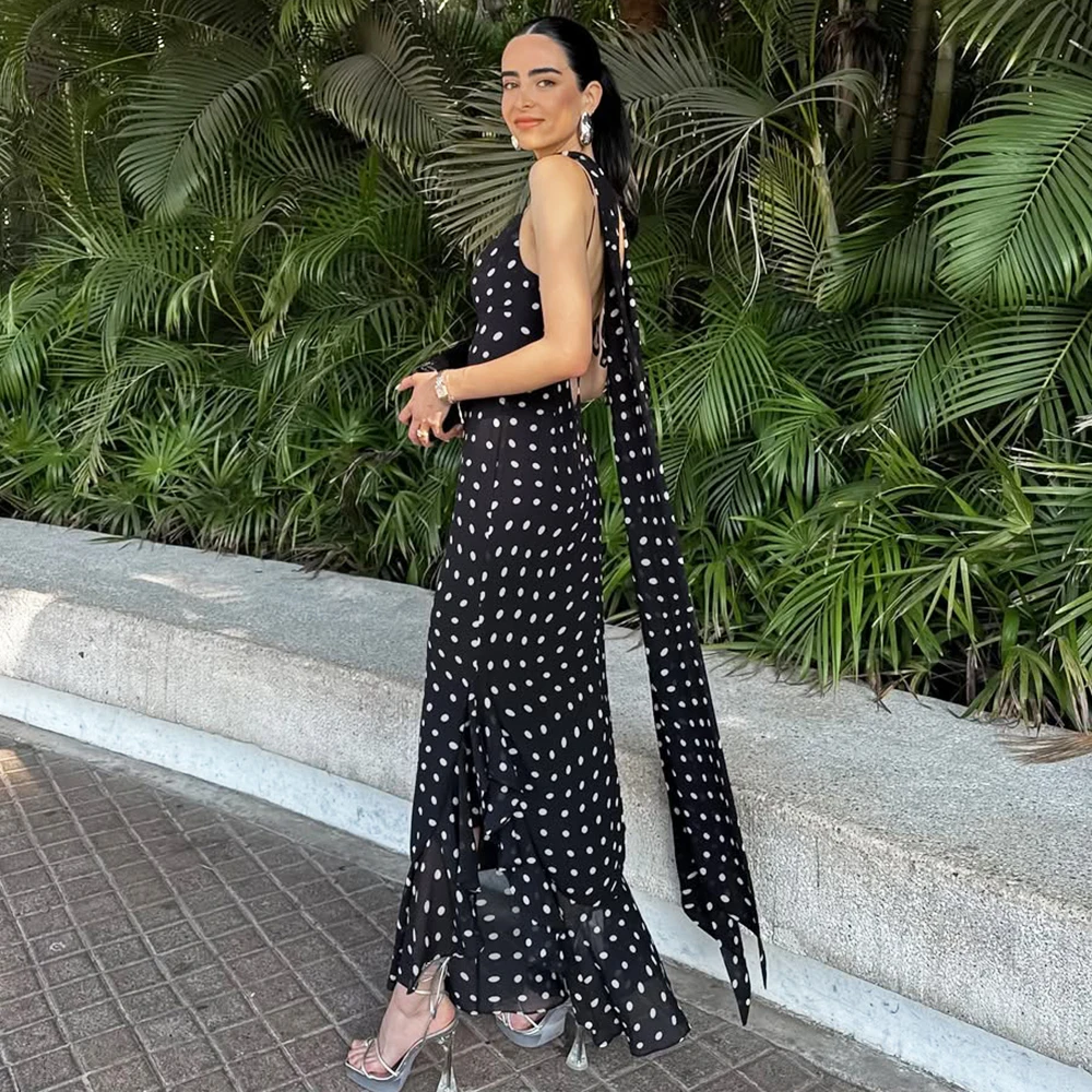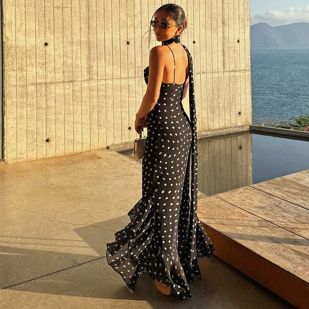 Luxury Sleeveless Polka Dot Halter Maxi, Pleated Ruffle Tie