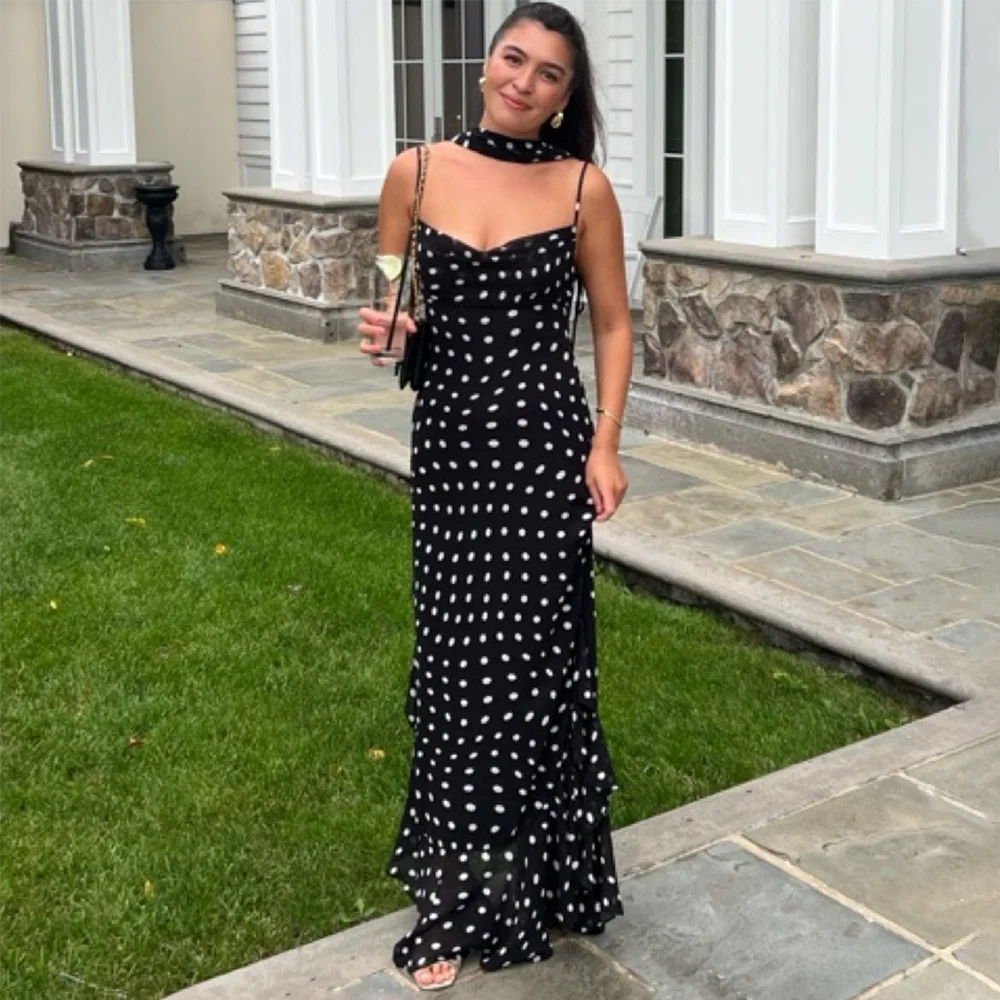 Opulent black polka-dot maxi with pleated silhouette, slash neckline and ruffle-tie halter-inspired spaghetti straps. Lightweight polyester with tatting and patchwork details, slight stretch and streamlined fit—pullover ankle-length for resort, casual or formal wear.