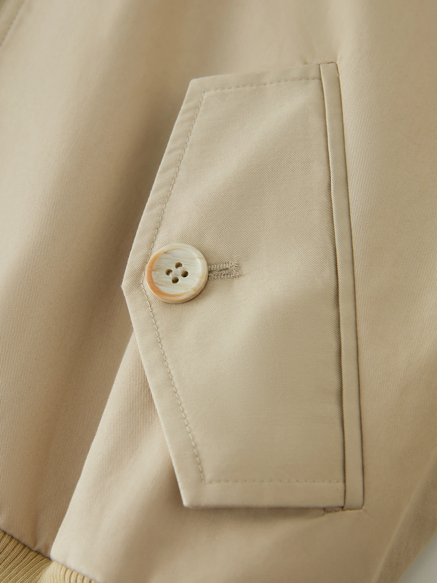 Q: What is the fabric composition and how does it feel?A: Made from a blend of 67.3% cotton and 32.7% polyester/polyamide composite fiber, the fabric offers a soft yet structured feel suitable for mild weather.