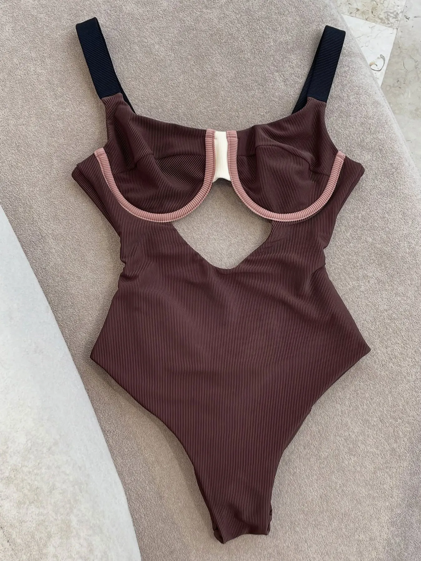 Crafted from polyester with a solid mocha tone, this swimsuit pairs seamlessly with lightweight cover-ups or minimalist sandals for a calm, modern look.
