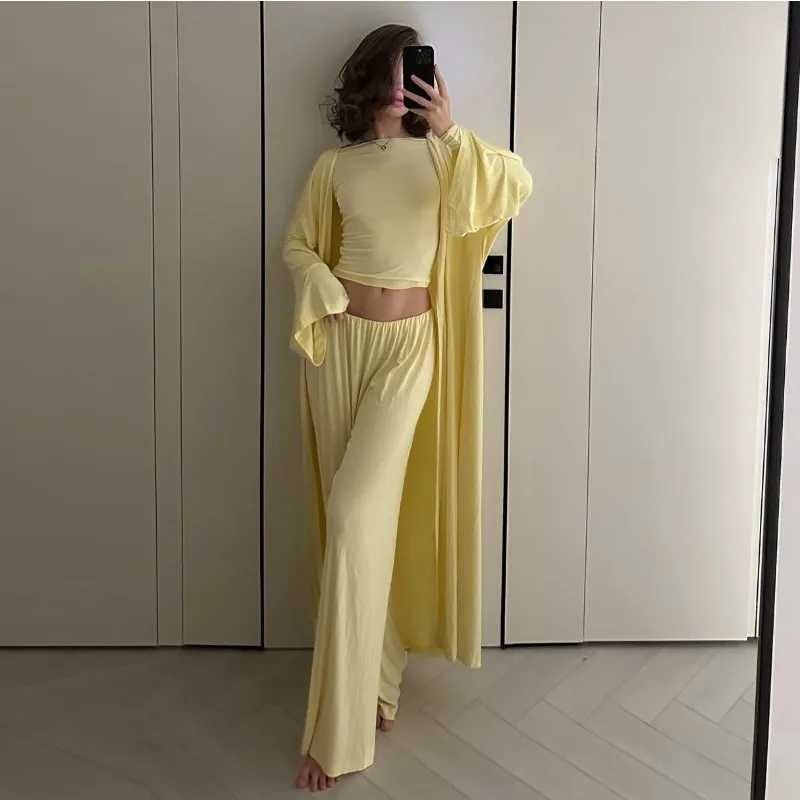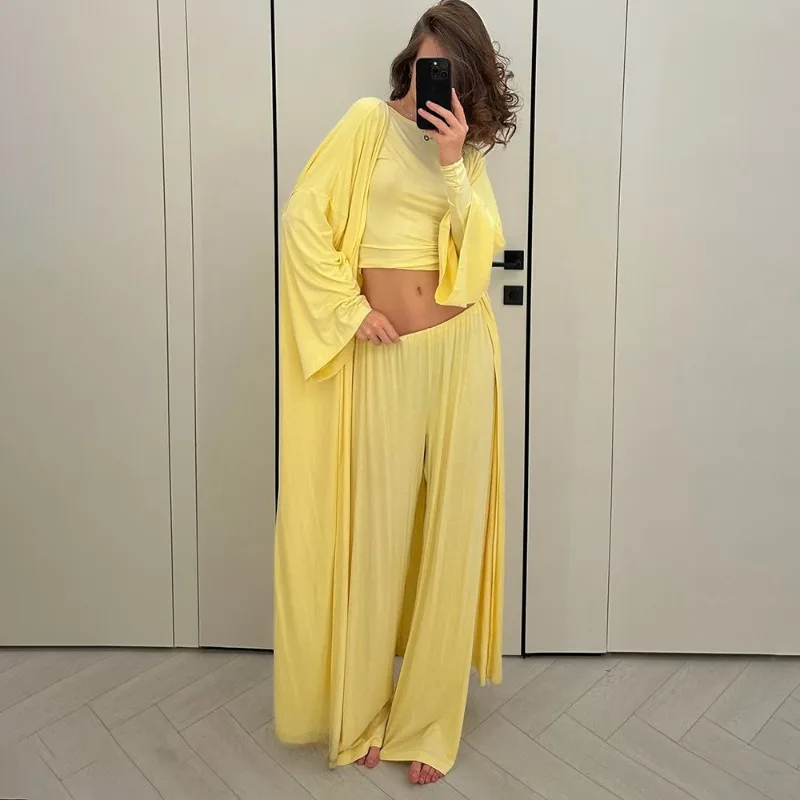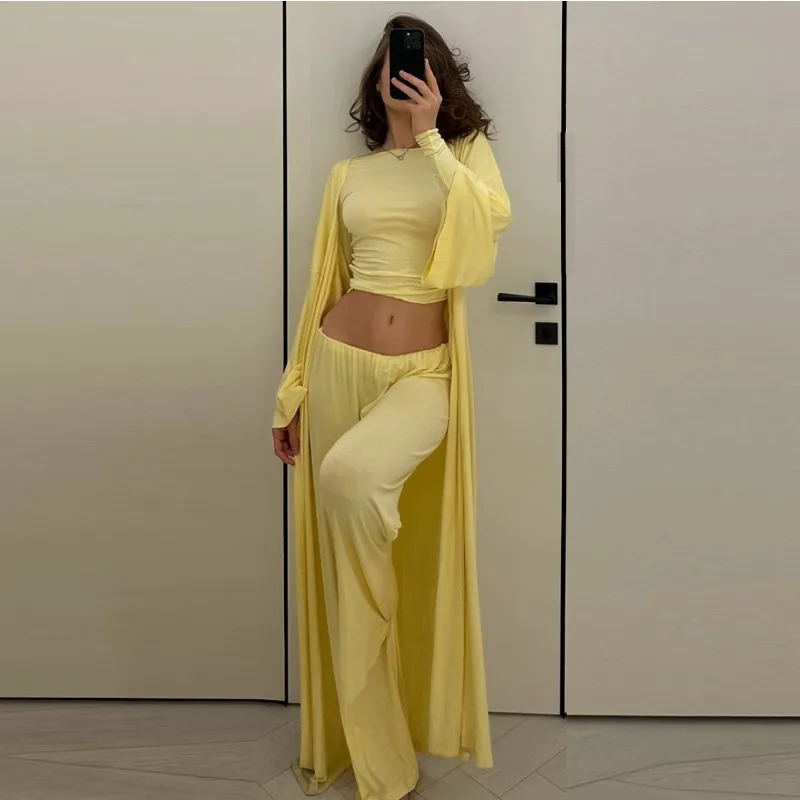 - – Three-piece set includes a loose cardigan, stylish top, and ankle-length trousers