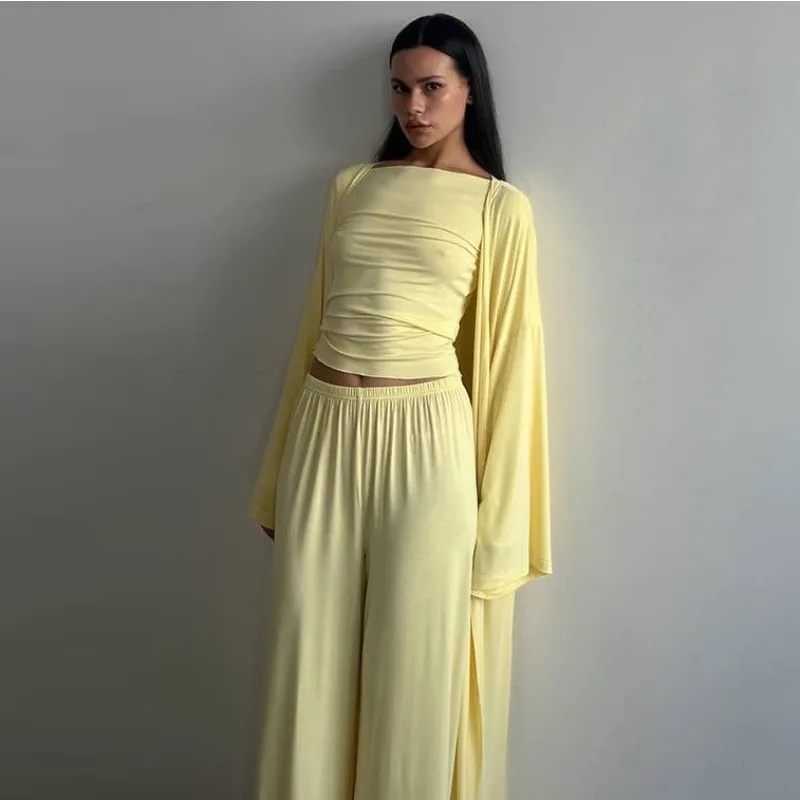 Elevate your wardrobe with this luxurious 3-piece pant set, perfect for the modern office lady. Crafted from soft, man-made fibers, it features a relaxed fit with elegant folds and spliced details. Available in chic colors like black, brown, yellow, and pink, this versatile outfit transitions effortlessly from day to night. Experience effortless style and confidence in every step.