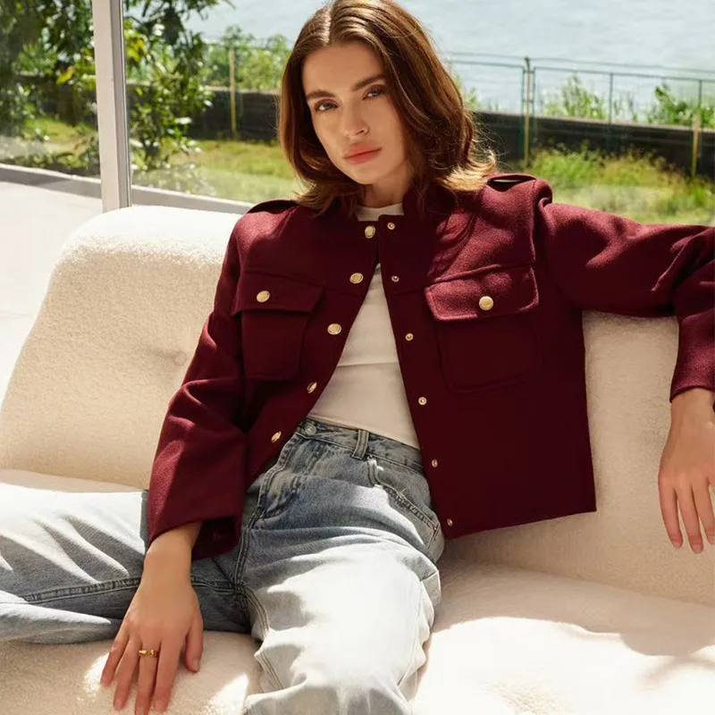 Embrace autumn elegance with this luxurious burgundy short jacket, designed for a relaxed fit. Crafted from thick polyester, it features a stylish single-breasted closure and chic three-quarter sleeves. Perfect for layering, its solid color and button detailing make it a versatile addition to your wardrobe. Step out in warmth and sophistication this season.