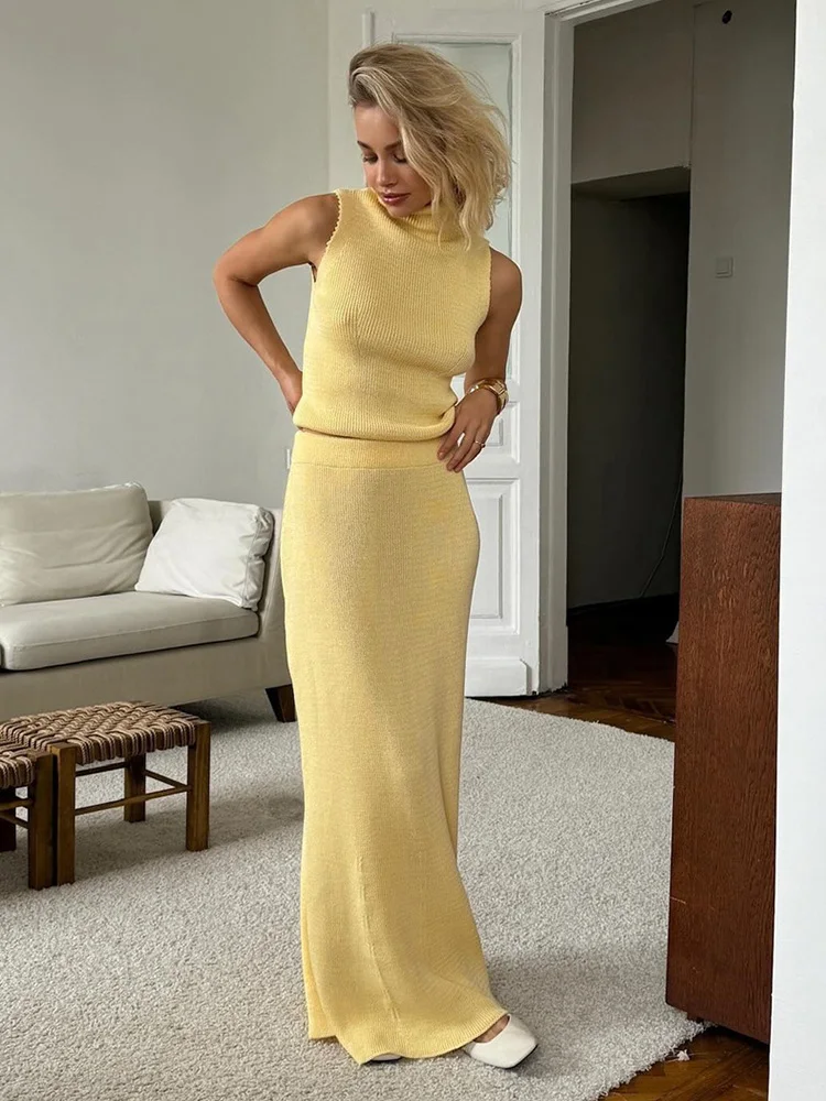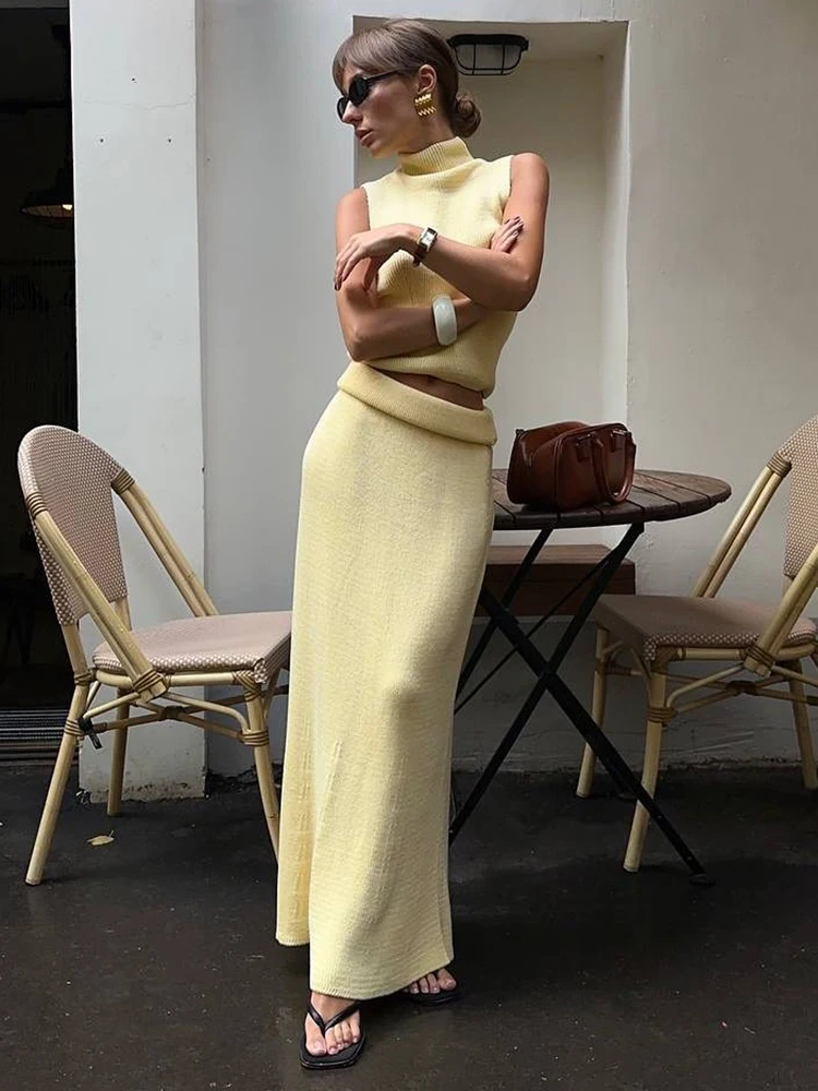 Chic Sleeveless Knitted Turtleneck & High-Waisted Skirt Set