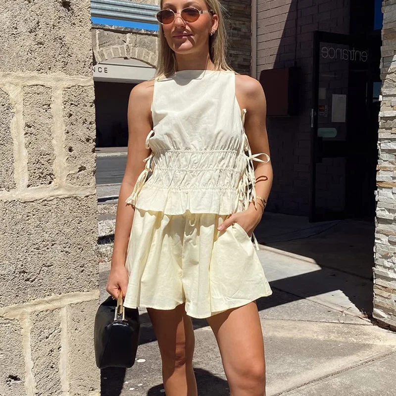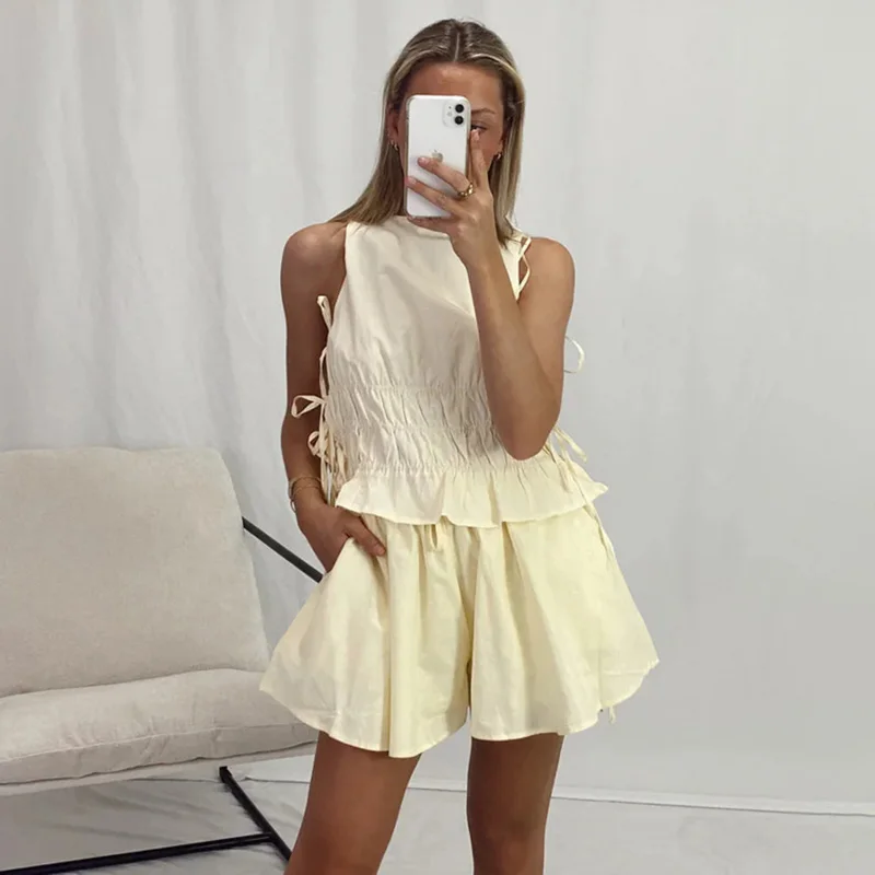 Step into summer with this luxurious vest and shorts suit, designed for effortless elegance. The sleeveless lace-up vest pairs beautifully with relaxed-fit shorts, offering a chic look for any vacation. Crafted from high-quality synthetic fibers, it ensures comfort and style. Embrace your confident, modern vibe in this timeless ensemble.