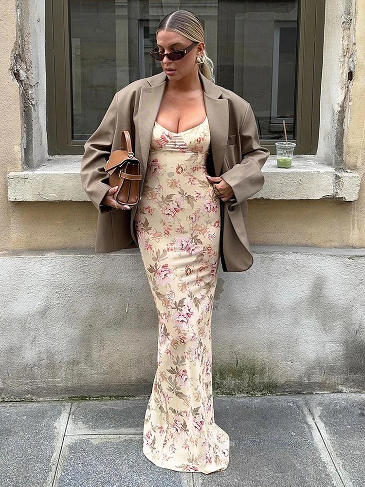 Luxurious Elegance Awaits with the Flower Print Slit Suspender Dress