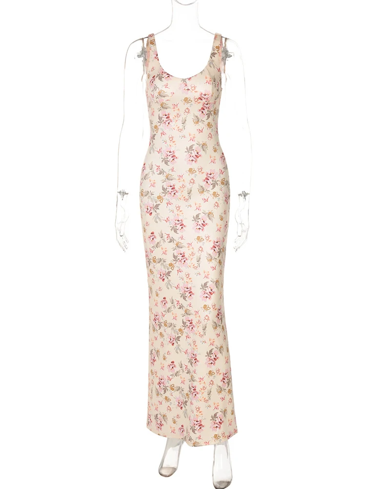 Elegant Apricot Flower Print Suspender Dress for Parties