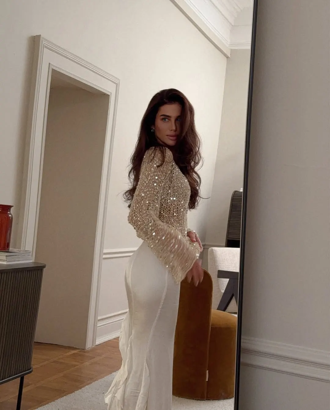 7 reviews for Beige Sequin Hollow-Out Pullover Top for Effortless Chic