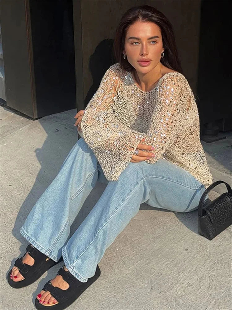 Chic Elegance: Knit Hollow Out Sequin Pullover Top