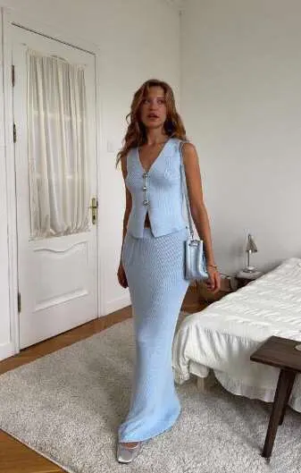 Introducing the epitome of summer elegance, the Knitted V-Neck 2 Piece Set – a sophisticated combination of style and comfort designed for every body. This stunning ensemble, featuring a chic sleeveless top adorned with a striking metal button and a flowing ankle-length skirt, is perfect for any summer occasion, from casual gatherings to elegant parties. Available in an array of vibrant colors, this set promises to brighten up your wardrobe while ensuring you feel effortlessly beautiful.