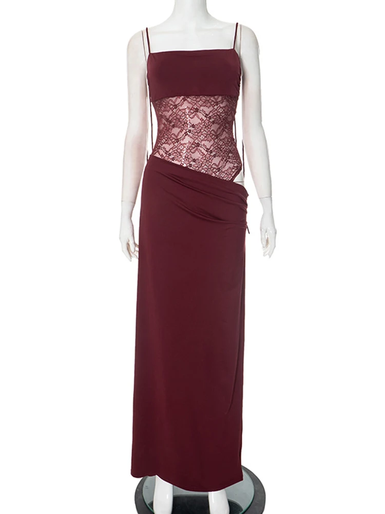 Unveil your inner elegance with this stunning lace splice spaghetti strap dress. Crafted from luxurious synthetic fibers, its ankle-length silhouette drapes beautifully, while the lace-up waist accentuates your figure. Perfect for summer beach parties, this sleeveless design is available in a variety of chic colors. Embrace sophistication and charm effortlessly.