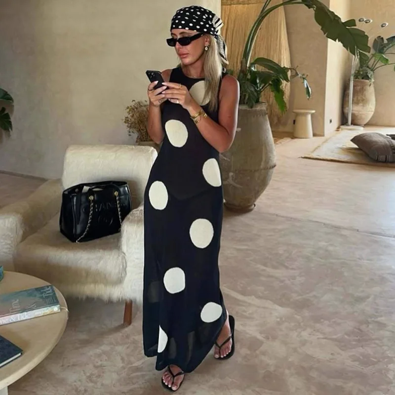 Step into summer with the Moopsi Polka Dot Knitted Maxi Dress, a stunning blend of comfort and chic style designed for the modern woman. This delightful sleeveless dress is perfect for beach outings, garden parties, or casual strolls along the shoreline. The playful polka dot pattern adds a touch of whimsy, while the elegant silhouette ensures you look effortlessly put together.
