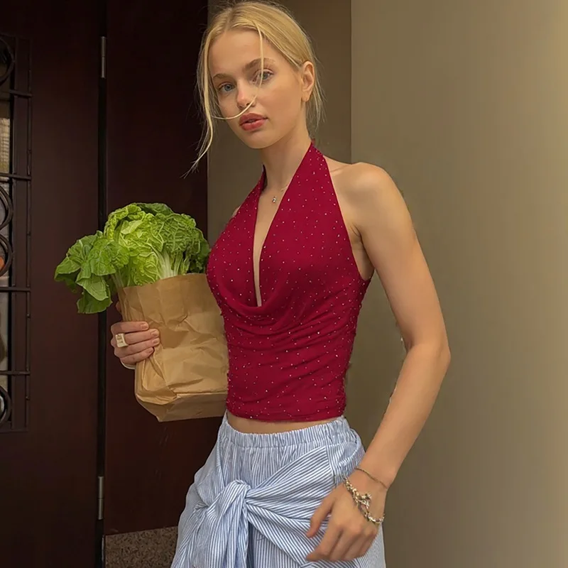 Unleash your inner elegance with this sophisticated V-neck halter top, designed for unforgettable summer soirées. Available in classic black, pristine white, chic khaki, and rich wine red, this backless beauty features a flattering pleated design and slight stretch for comfort. Perfect for parties or romantic evenings, it effortlessly combines style and allure. Embrace luxury this season with a statement piece that celebrates every body.
