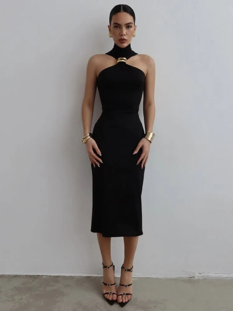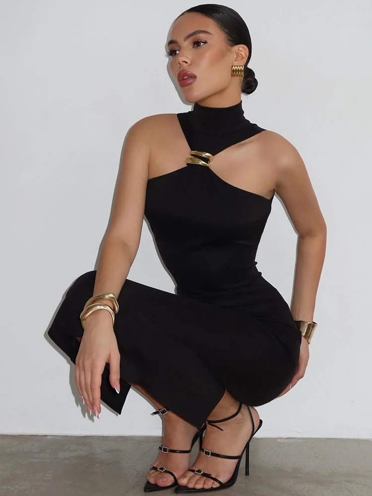 Step into sophistication with this stunning black turtleneck off-shoulder maxi dress. Crafted from a luxurious knit blend, its sleek silhouette embraces your curves while offering a flattering fit. Perfect for summer soirées, this sleeveless design features a half-open collar and mid-calf length, making it a timeless addition to your wardrobe. Unleash your inner elegance and turn heads at every occasion.