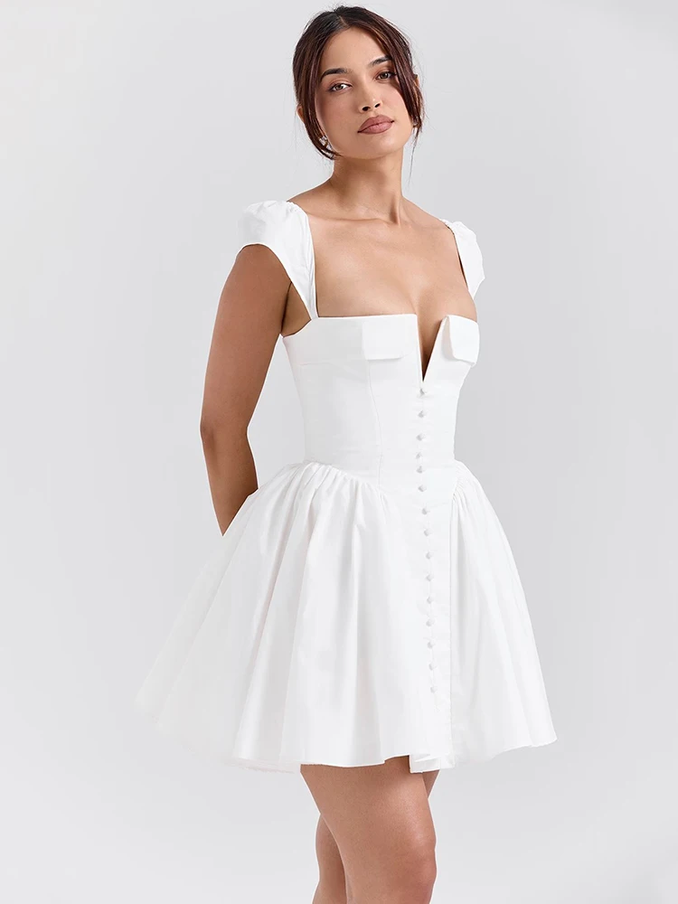 Step into sophistication with this stunning white backless mini dress. Featuring a square collar and short sleeves, it offers a flattering A-line silhouette that enhances your natural beauty. Crafted from luxurious natural fibers, this dress is perfect for club parties or elegant evenings. Its slight stretch ensures a comfortable fit, making it a must-have for your spring and summer wardrobe.