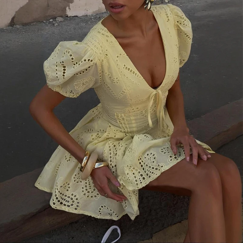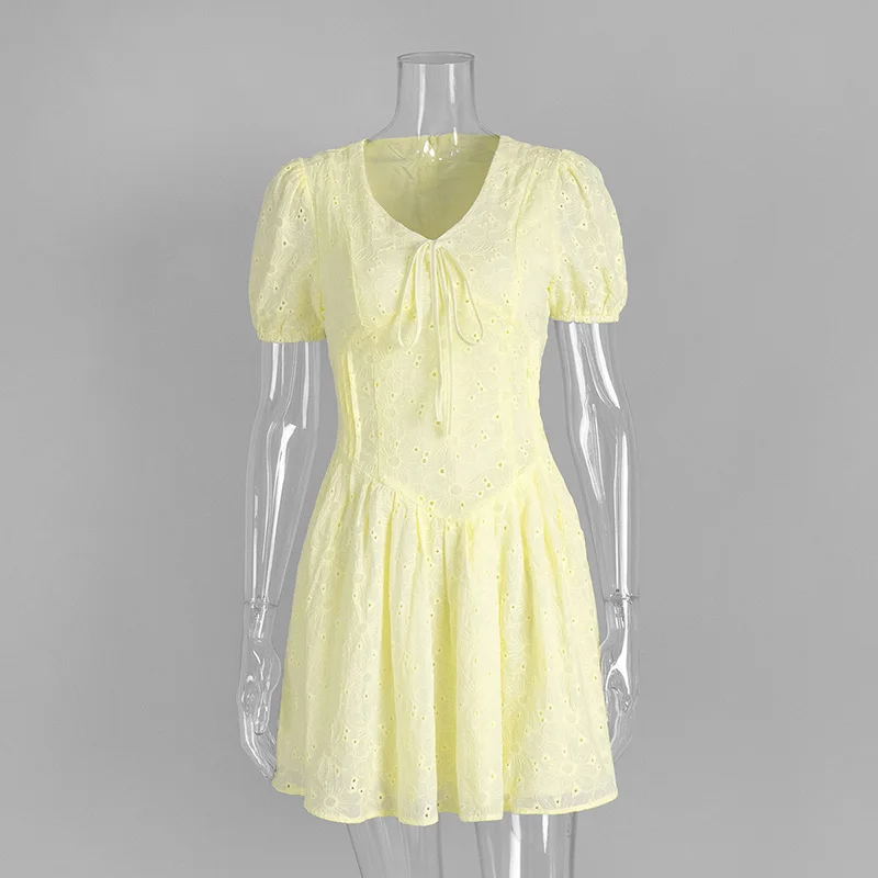 Step into summer with this stunning yellow high waist mini dress. Featuring a chic V-neck and delicate lace-up detailing, this A-line dress is crafted from soft, breathable fabric for ultimate comfort. Perfect for vacations or casual outings, its elegant style and flattering fit will make you the center of attention. Embrace effortless sophistication and make a statement.