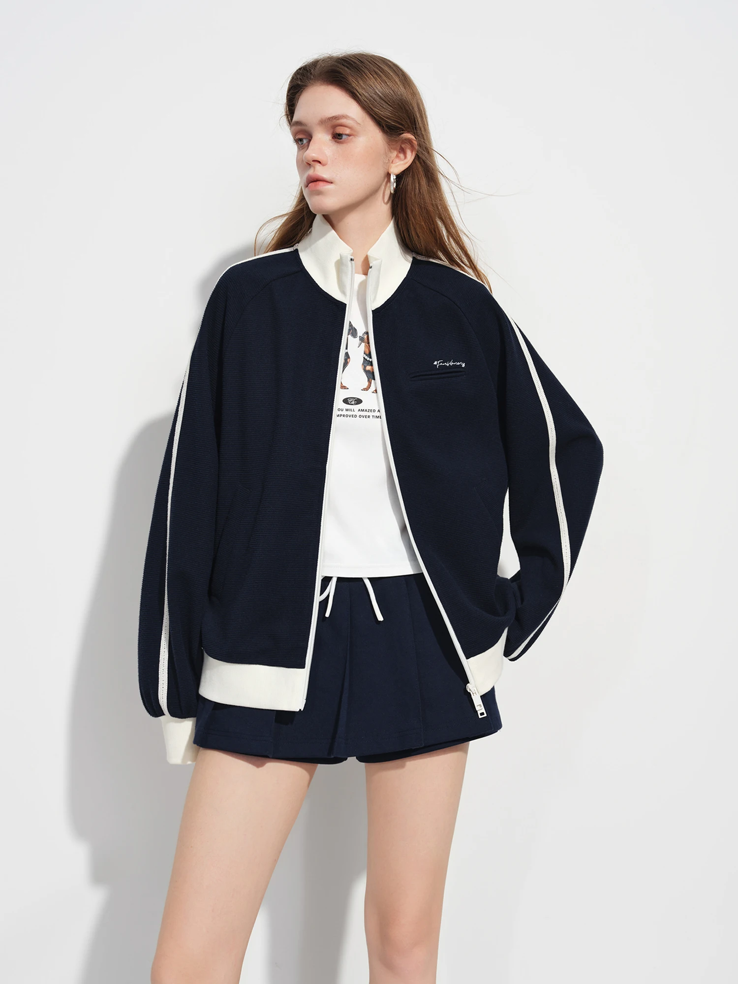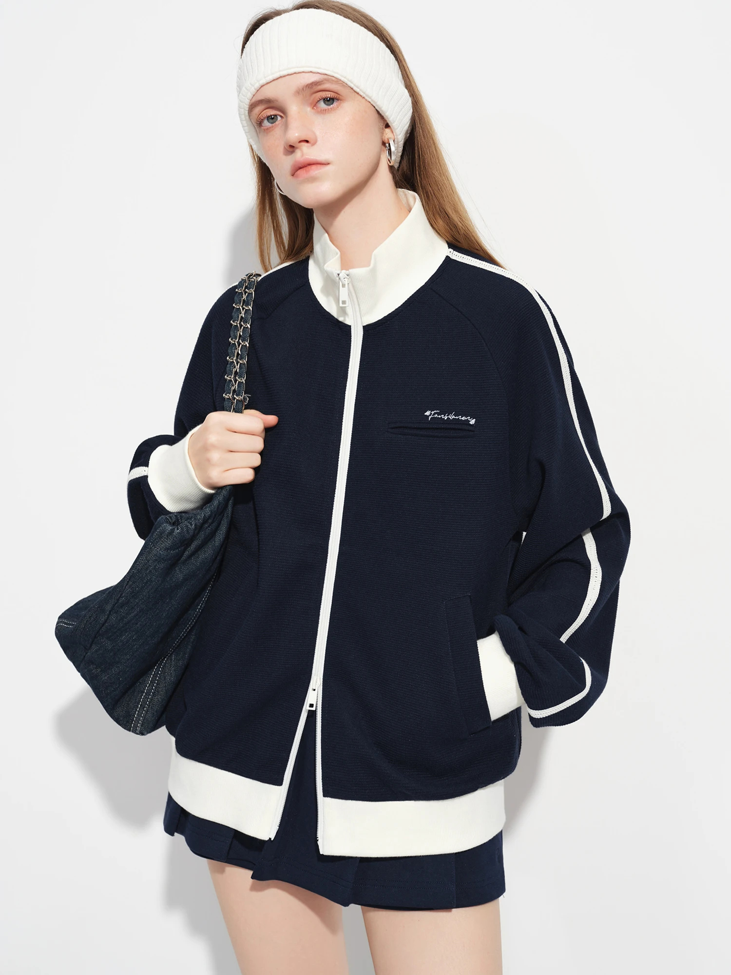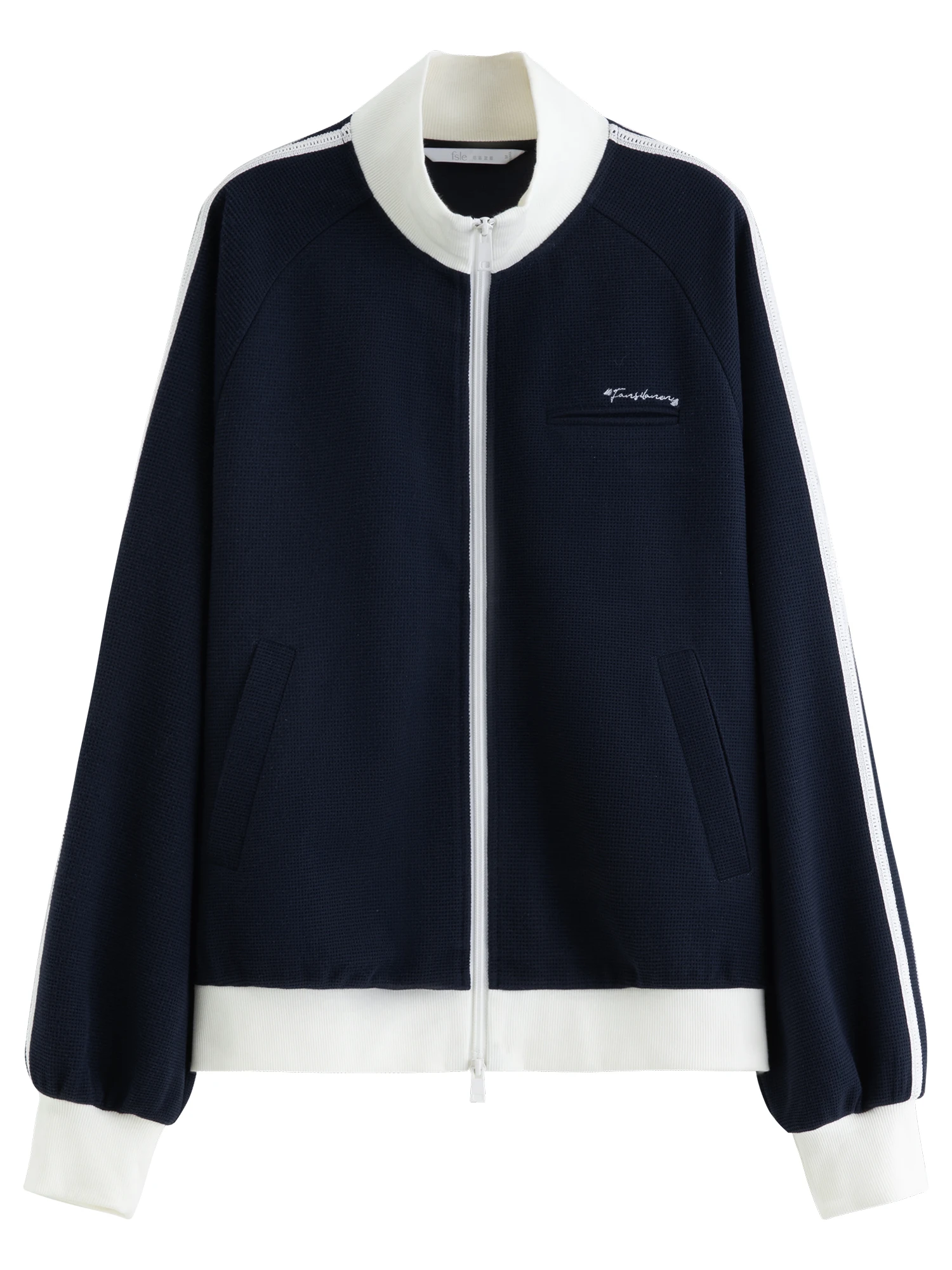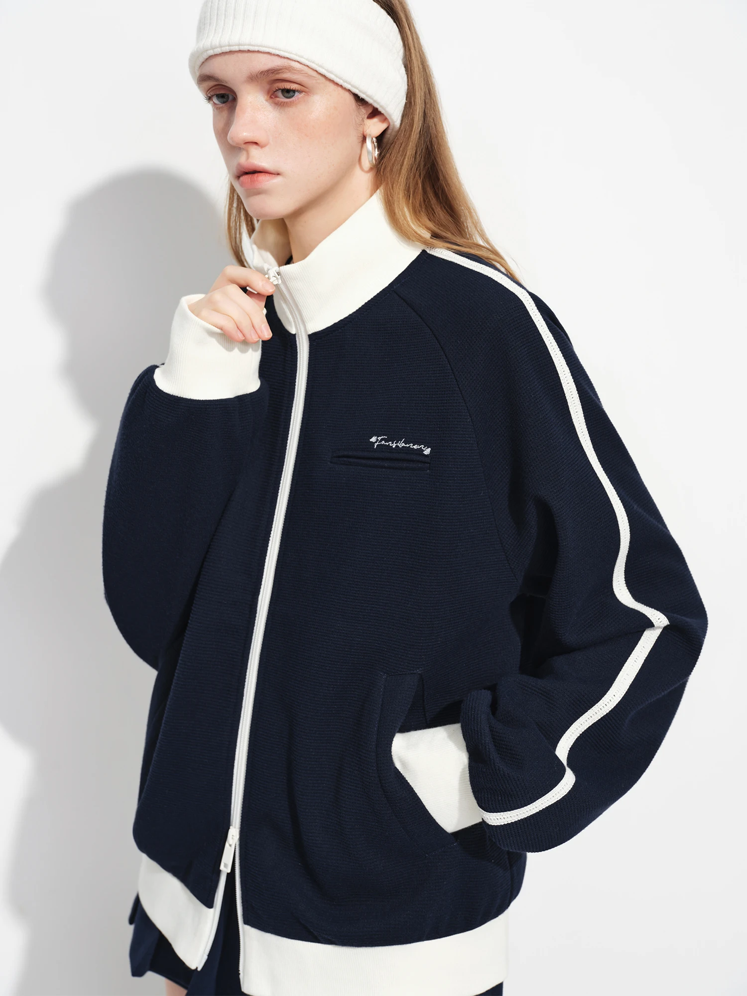 Navy Blue Stand Collar Waffle Knit Jacket with Double Zipper