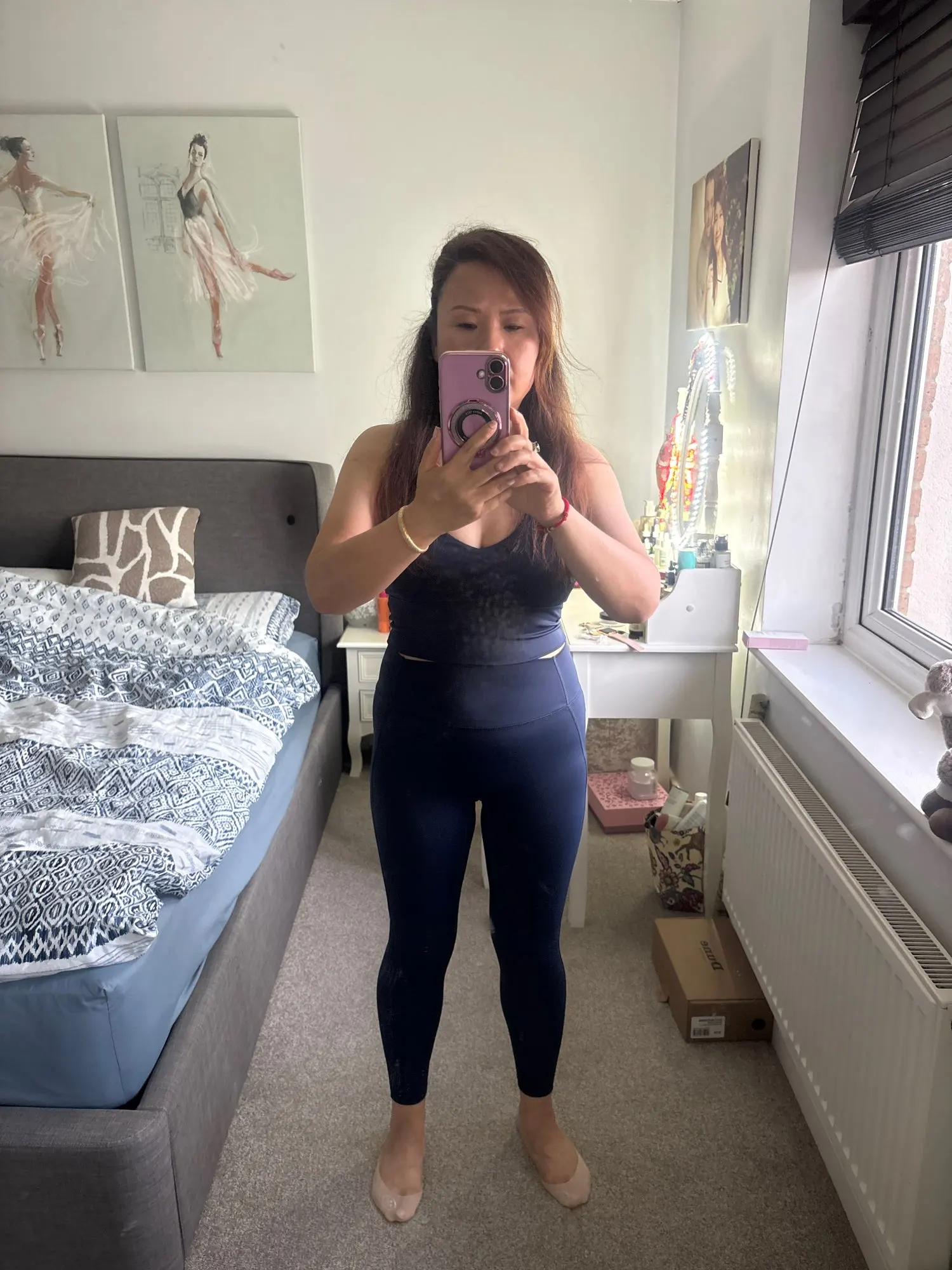 I ordered this set and I am delighted. 🥰 . The navy blue color is very beautiful and intense, it has an elegant appearance. It fits me perfectly! I ordered my usual size and everything fit perfectly: the leggings stretch very well and accentuate the figure, and the top holds the chest well while running.