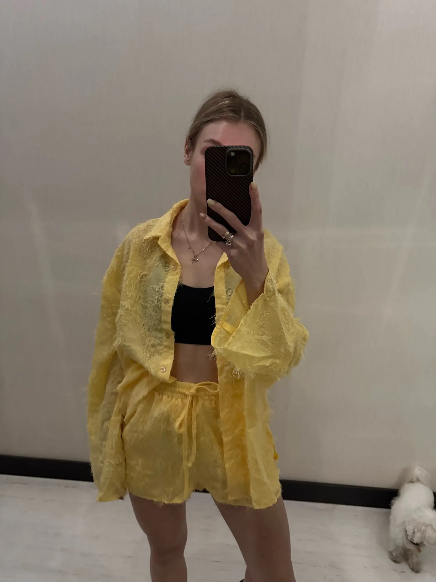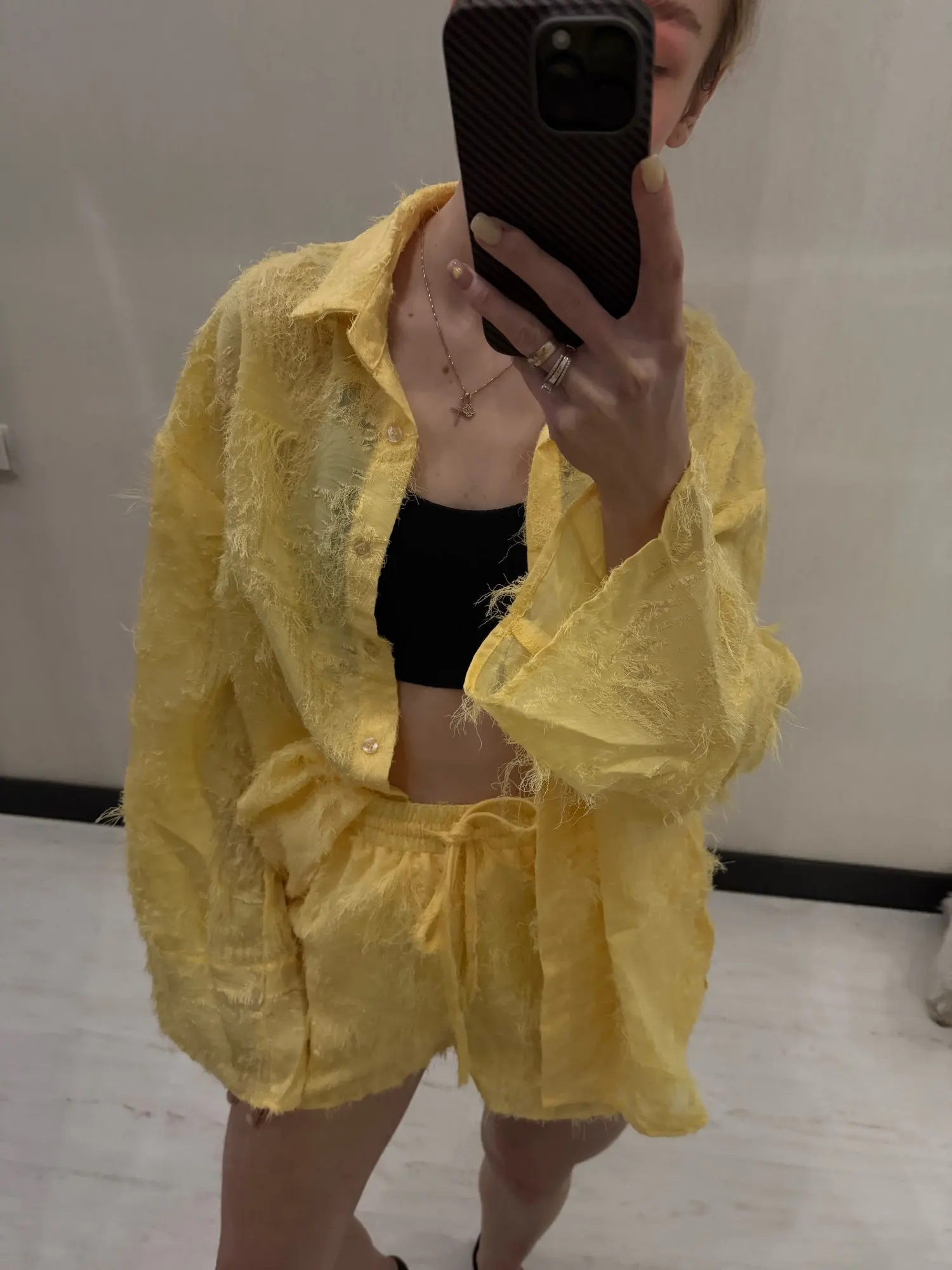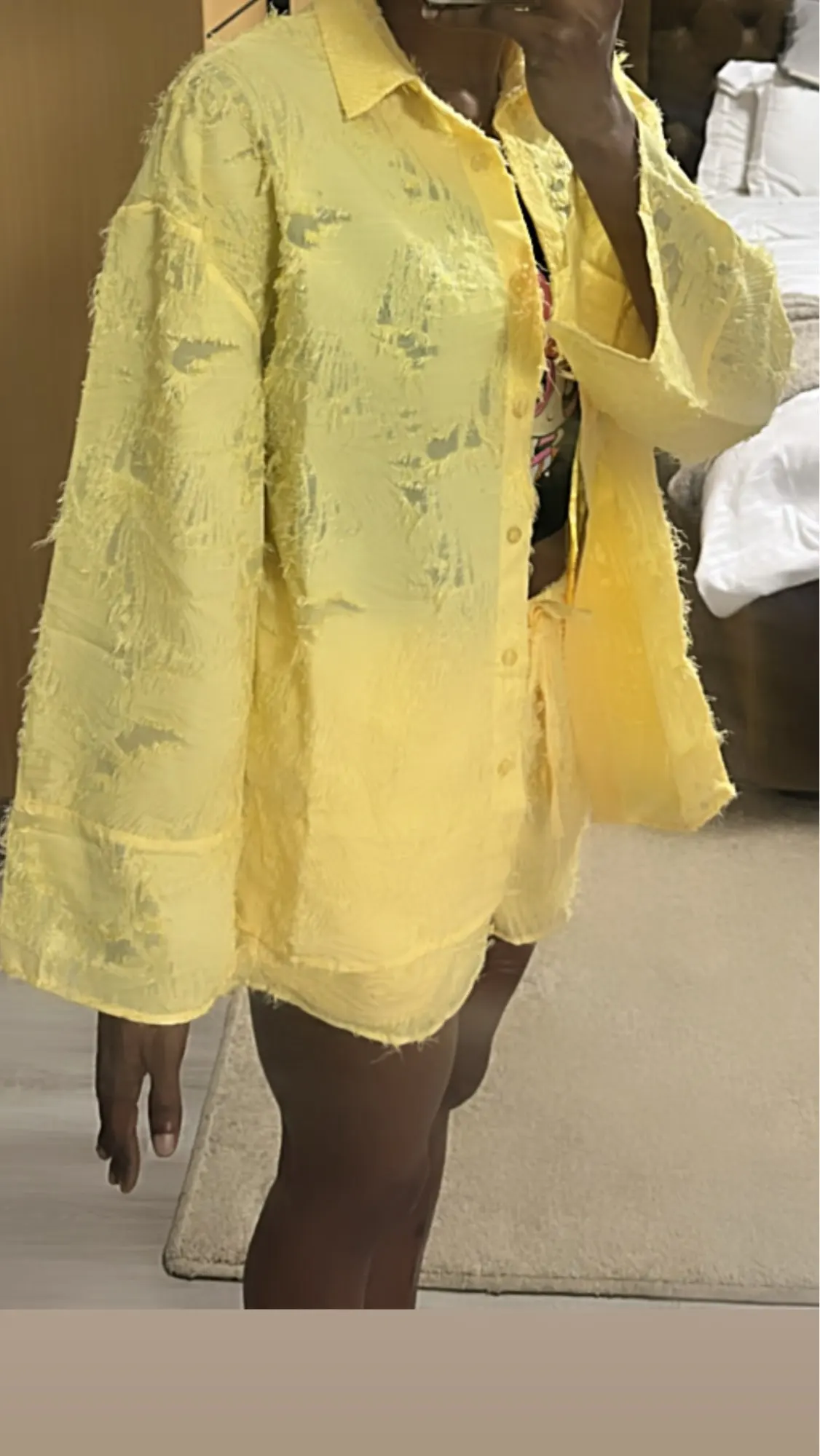 Step into elegance with this stunning Yellow Feather 2 Piece Set. Crafted from luxurious natural fibers, this outfit features a sophisticated long-sleeve button shirt with a chic turn-down collar, paired with comfortable drawstring shorts. Perfect for autumn streetwear, it combines style and comfort effortlessly. Available in sizes S-L.