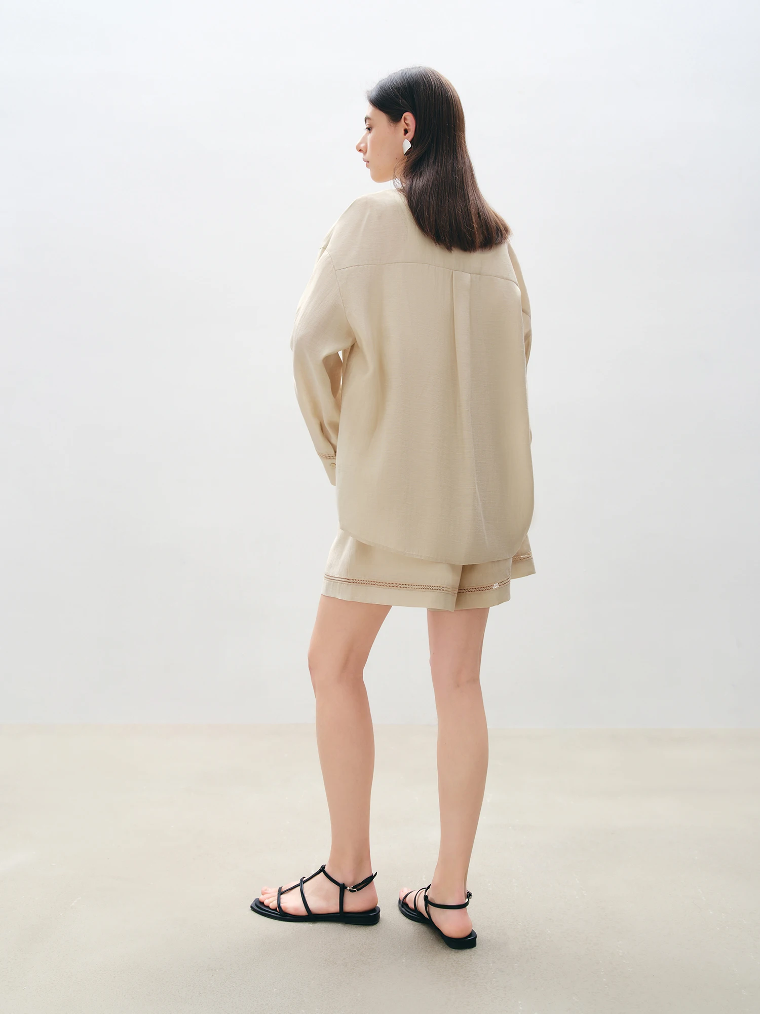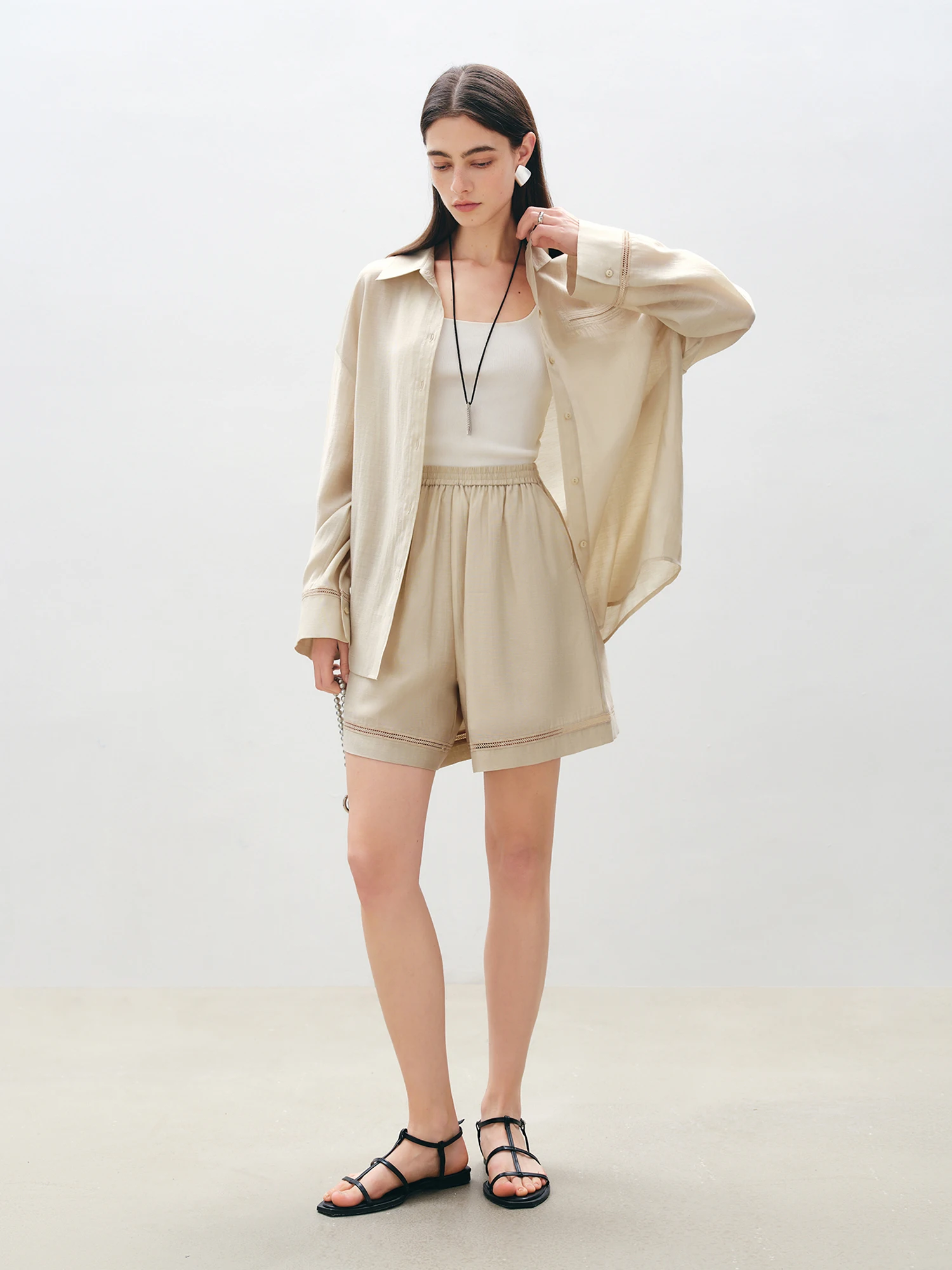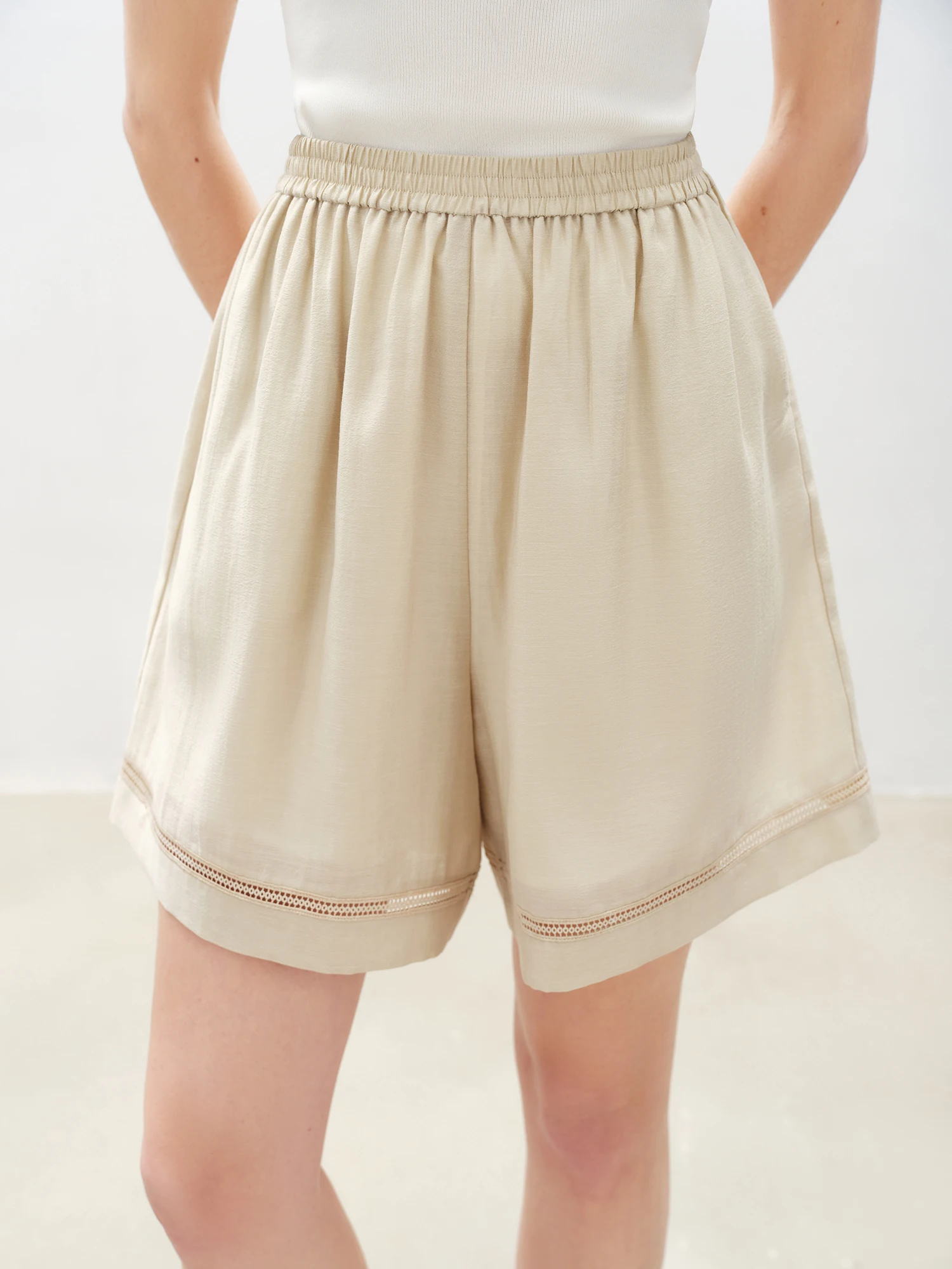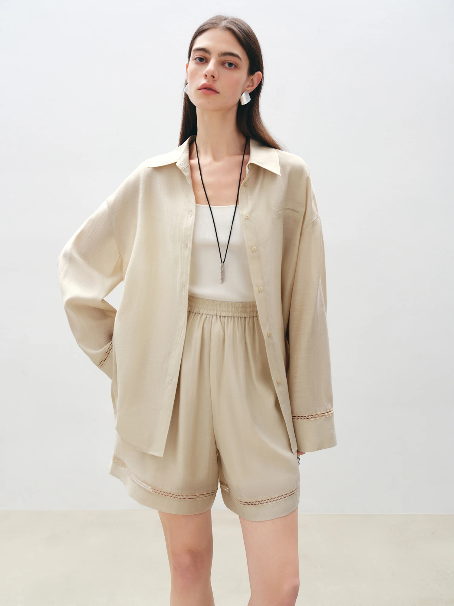 Sophisticated crochet linen blend two-piece set featuring relaxed shorts and turn-down collar top. Crafted with breathable Lyocell and acetate blend for ultimate summer comfort. Perfect office-to-weekend versatility with timeless tatting details and gentle stretch. Available in petite sizing XS-M.