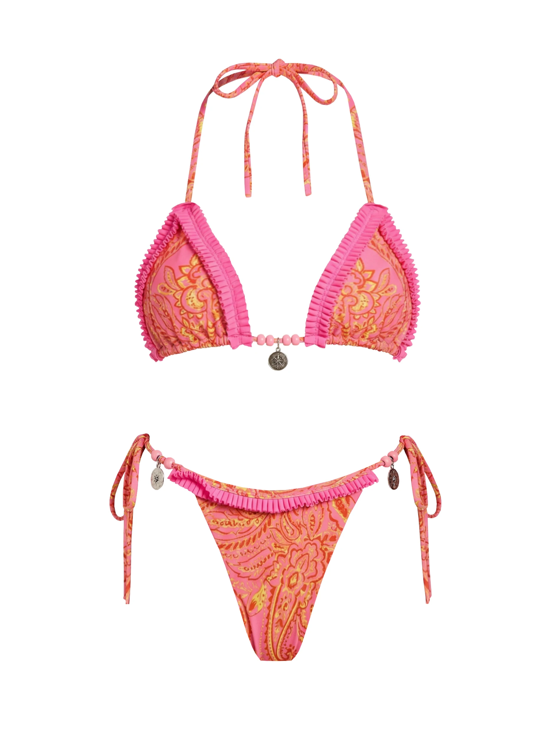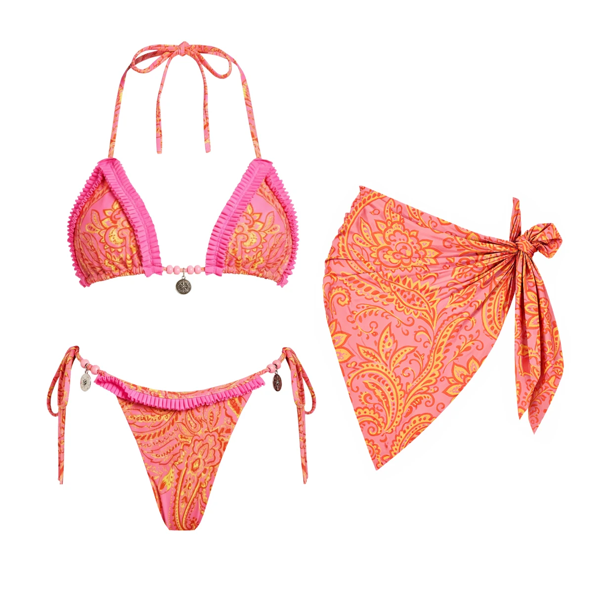 The Pink Paisley Beaded Halter Bikini Set offers a considered approach to beachwear, combining a classic paisley print with subtle bead detailing and a refined metal pendant. Designed for women who value both aesthetic and function, this bikini set features an underwire with padded cups, providing gentle support and a fit true to size.