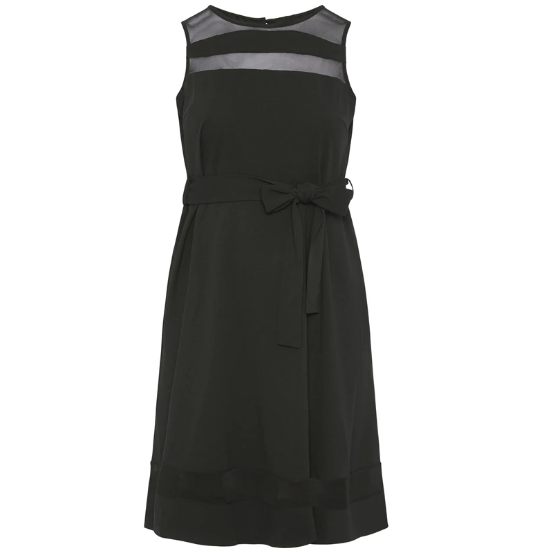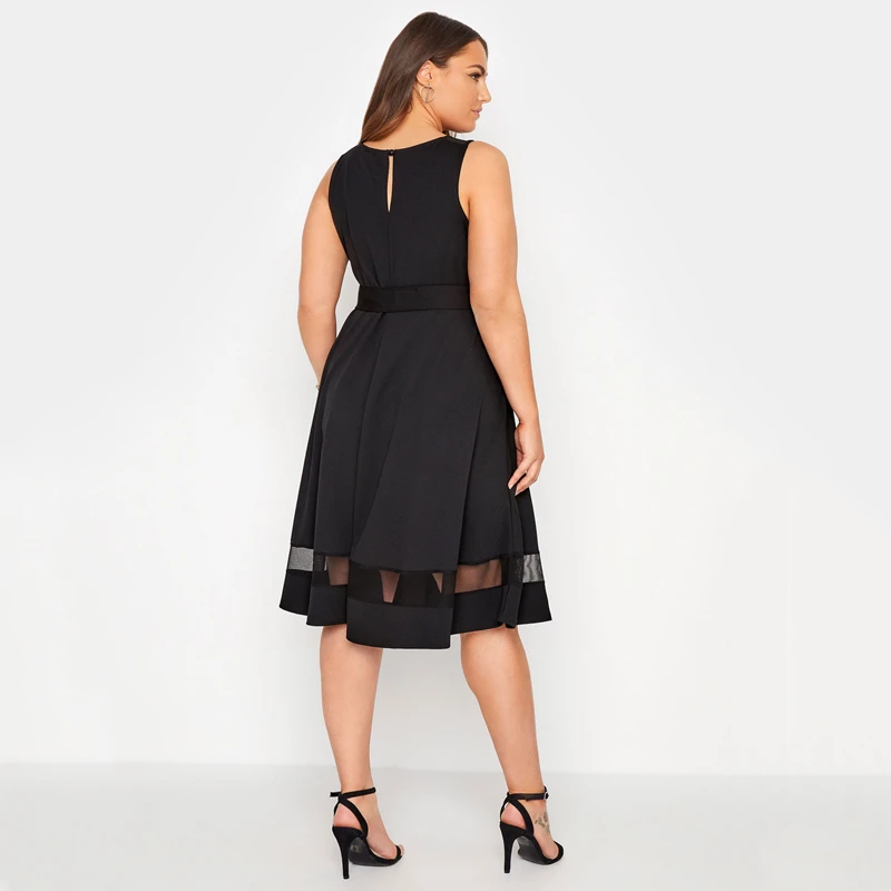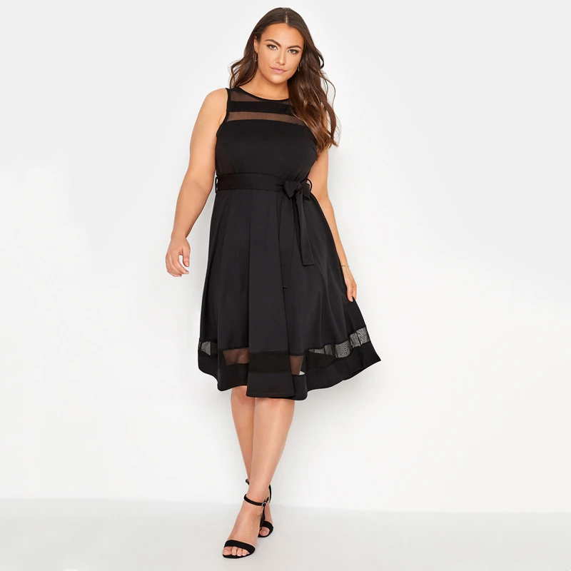 Plus Size Black A-Line Midi Dress with Mesh Panel for Women