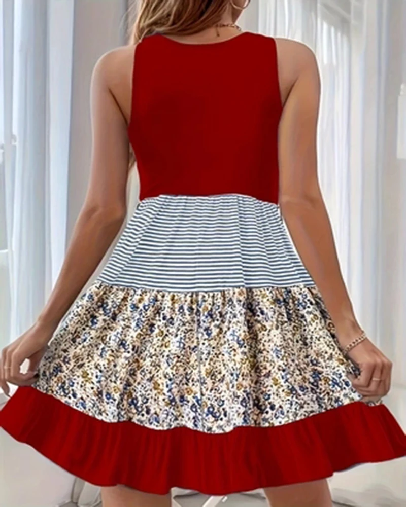 Plus Size Floral Stripe Vest Dress with Ruffle Hem Elegance