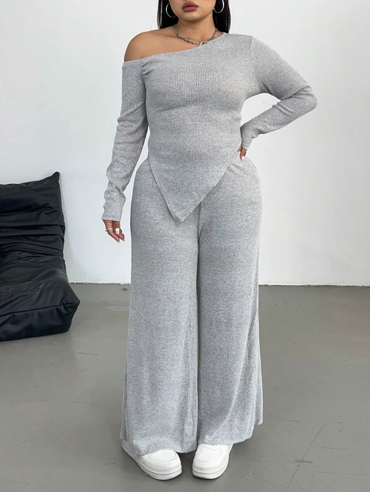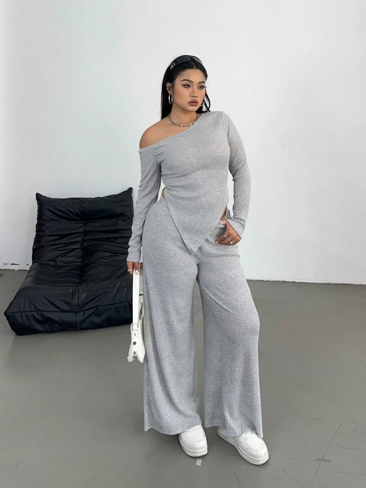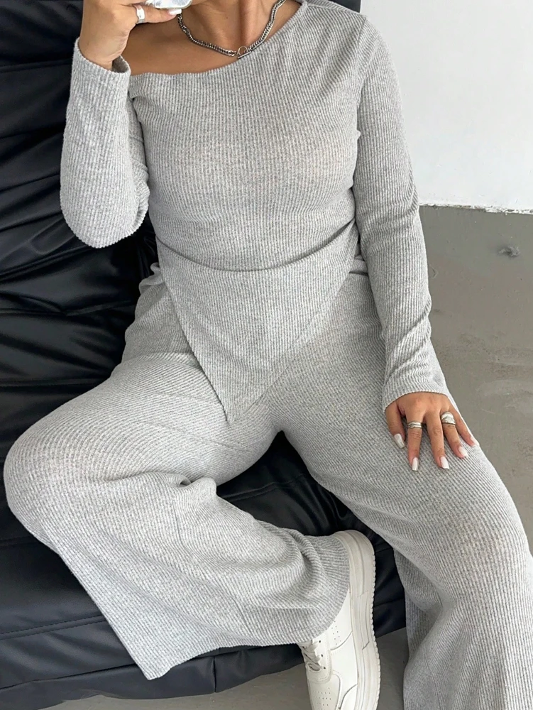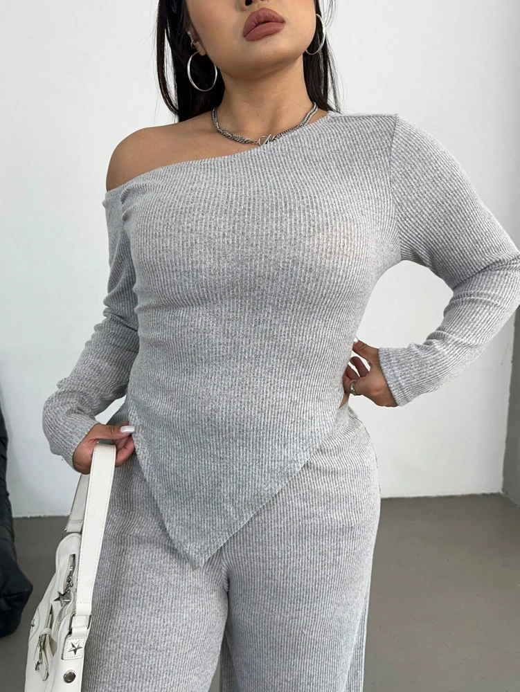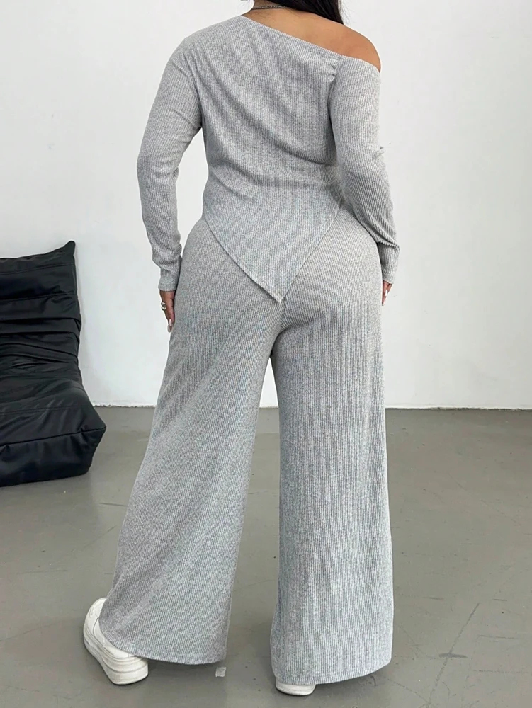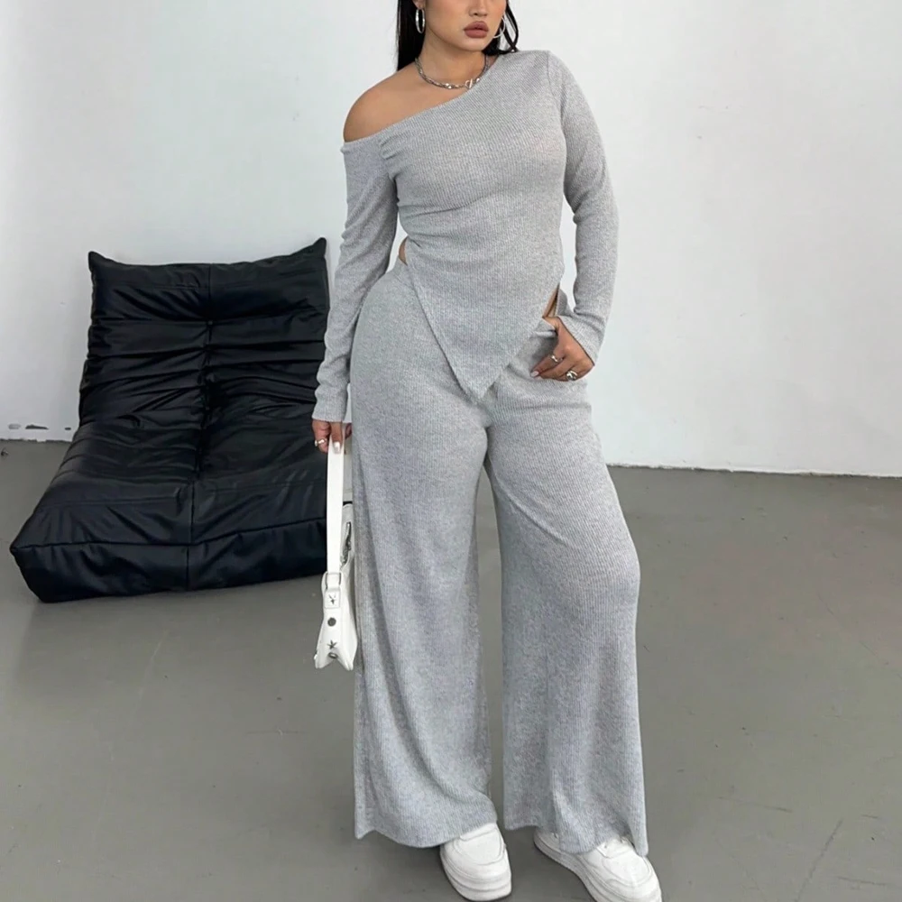 Grey Slash Shoulder Two Piece Set – Relaxed Wide Leg Comfort