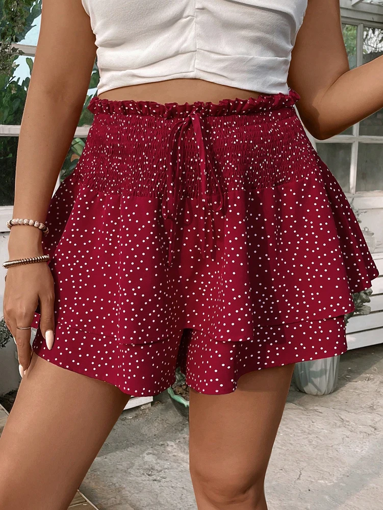 Step into summer with this luxurious burgundy polka dot print skirt, designed for a flattering silhouette. Featuring a comfortable elasticized waistband and a playful ruffled hemline, this double-layer skirt offers effortless style. Crafted from a soft blended fabric, it combines fashion and casual elegance, perfect for any occasion. Embrace your curves and make a statement with this exquisite piece.