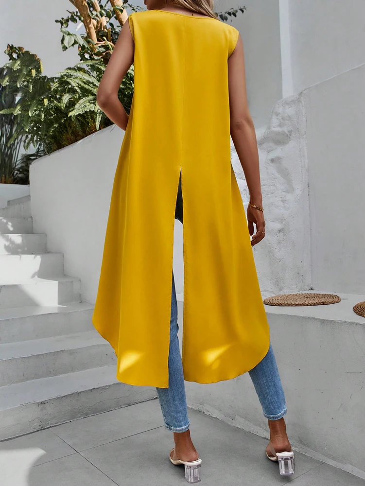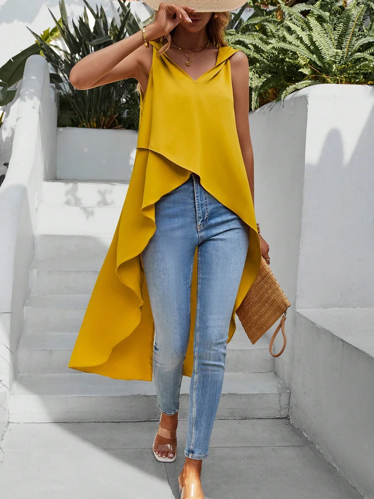 Embrace effortless elegance with this luxurious wrap edge sleeveless top, designed for every body. Crafted from soft chiffon, it features a flattering V-neck and high-low hem, offering a stylish silhouette. Available in vibrant colors, this versatile piece is perfect for summer outings or sophisticated office wear. Experience comfort and confidence today.
