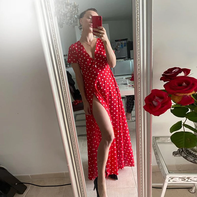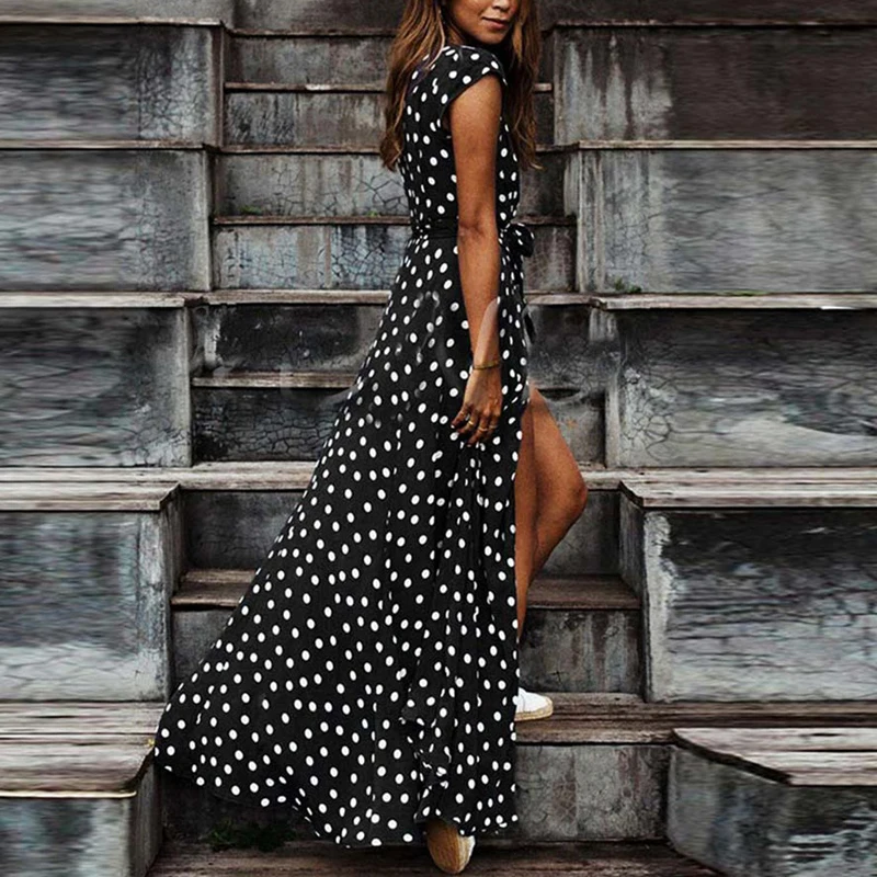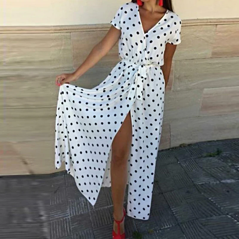 Resort-Ready Polka Dot Maxi — Split Hem, Belted V-Neck