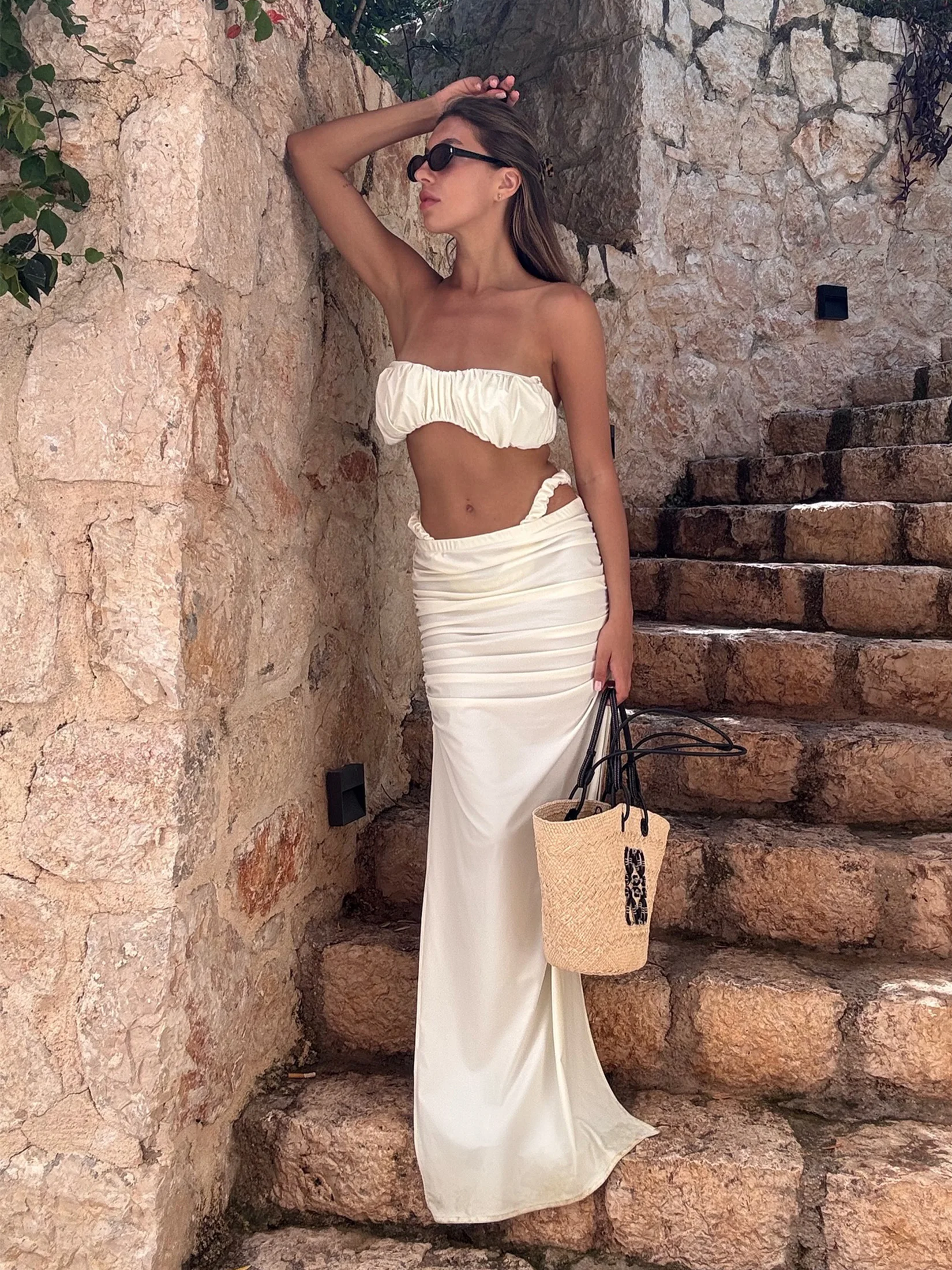 Step into a world of elegance and confidence this summer with the Chic Ruched Bandeau Bikini Set with Flowing High-Cut Skirt. Because every moment spent in the sun should be celebrated in style.